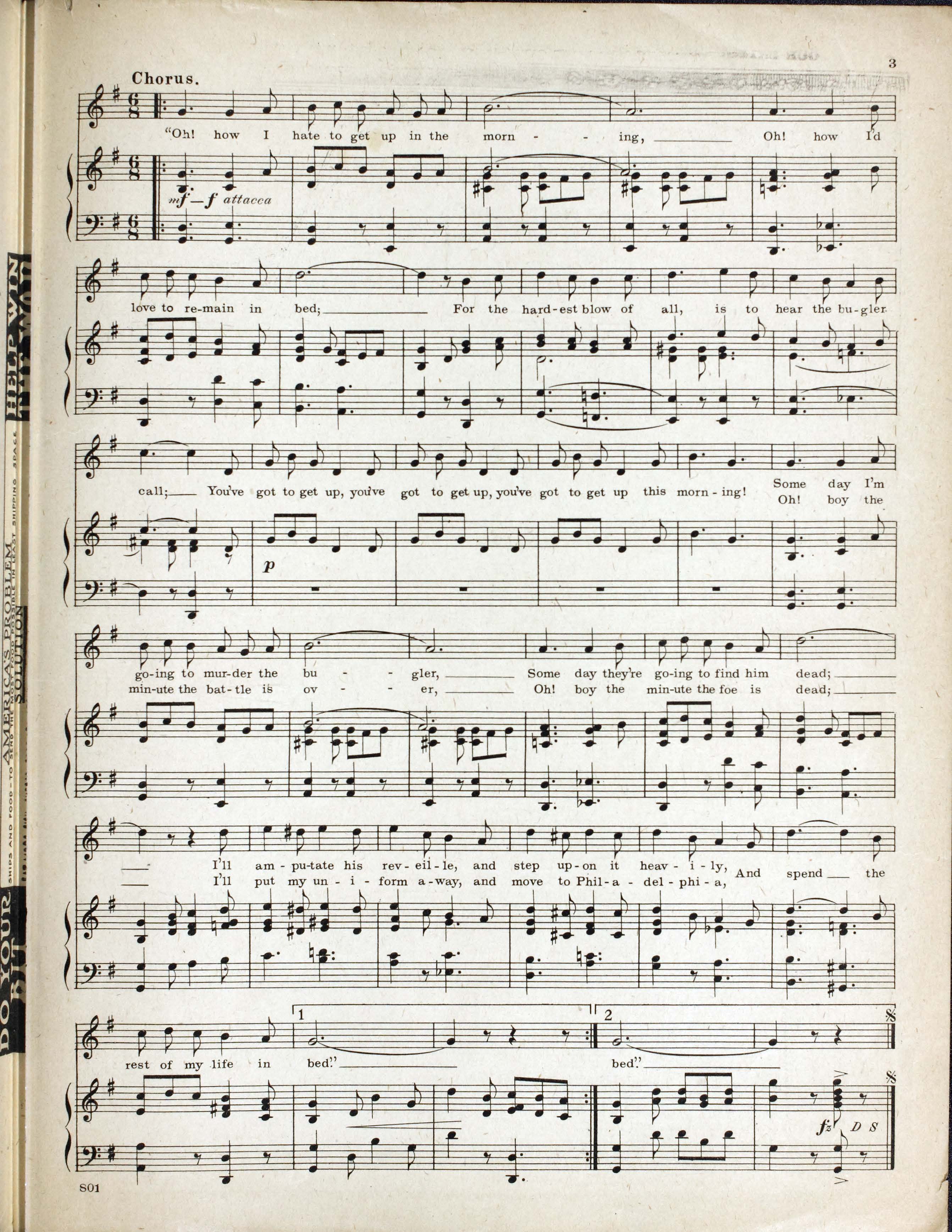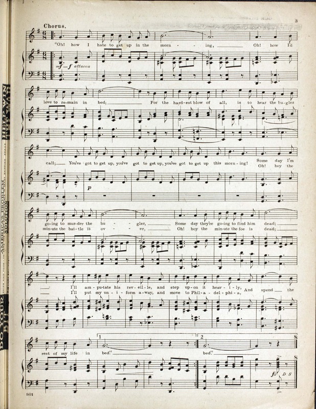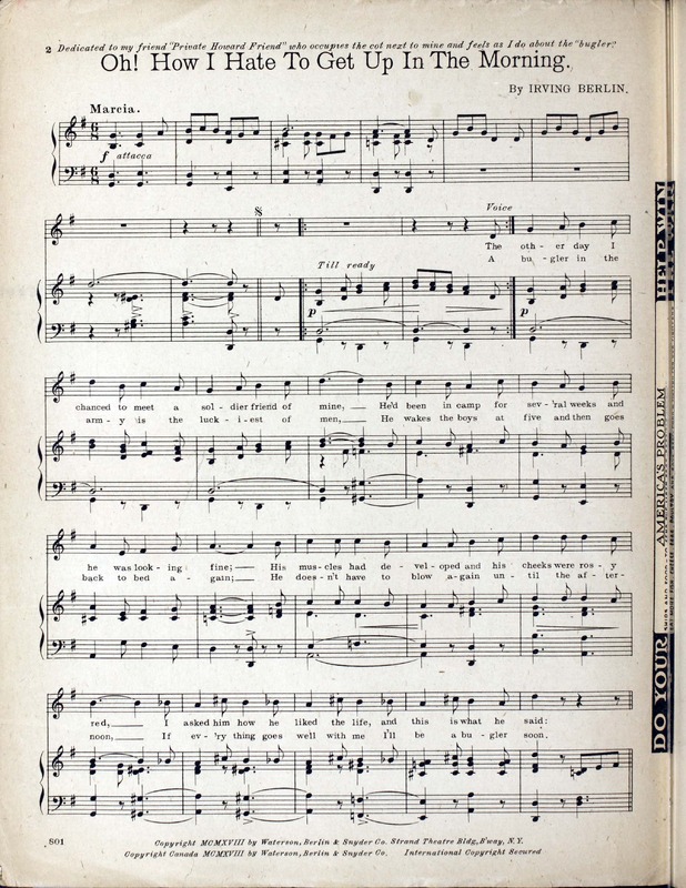 Berlin, Irving, 1888-1989. 2000. “Oh! How I Hate to Get up in the Morning By Irving Berlin”. New York (Strand Theater Bldg. Broadway at 47th St.) : Waterson, Berlin and Snyder Co, World War I Sheet Music, accessed April 2, 2026, https://digitalexhibits.library.wustl.edu/s/wwimusic/item/36939