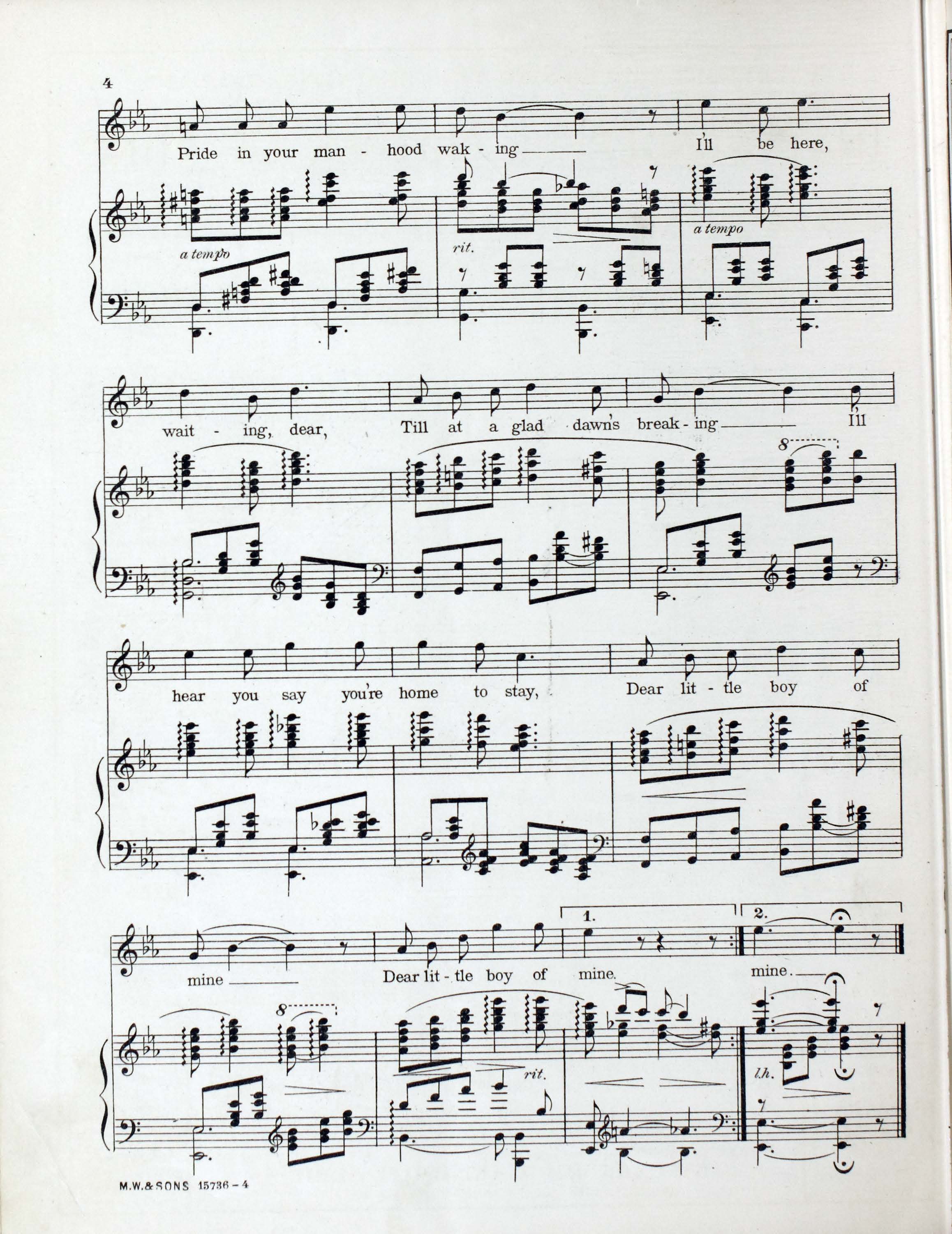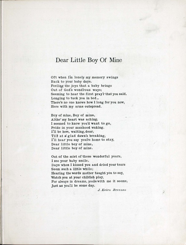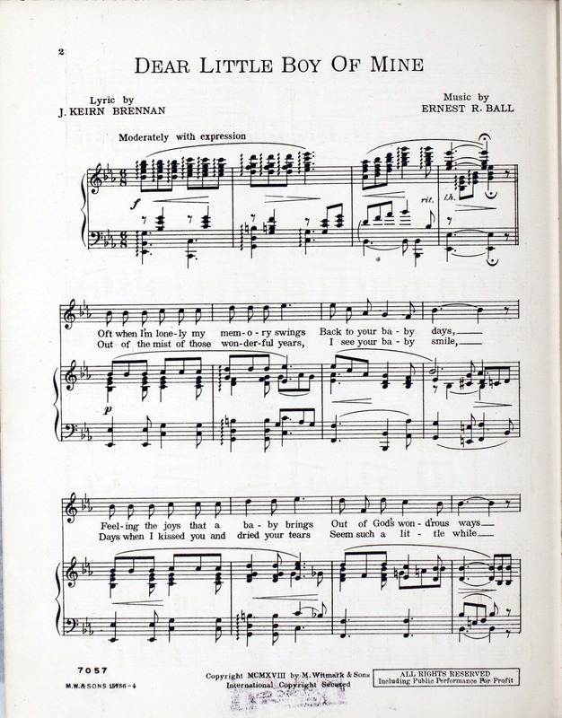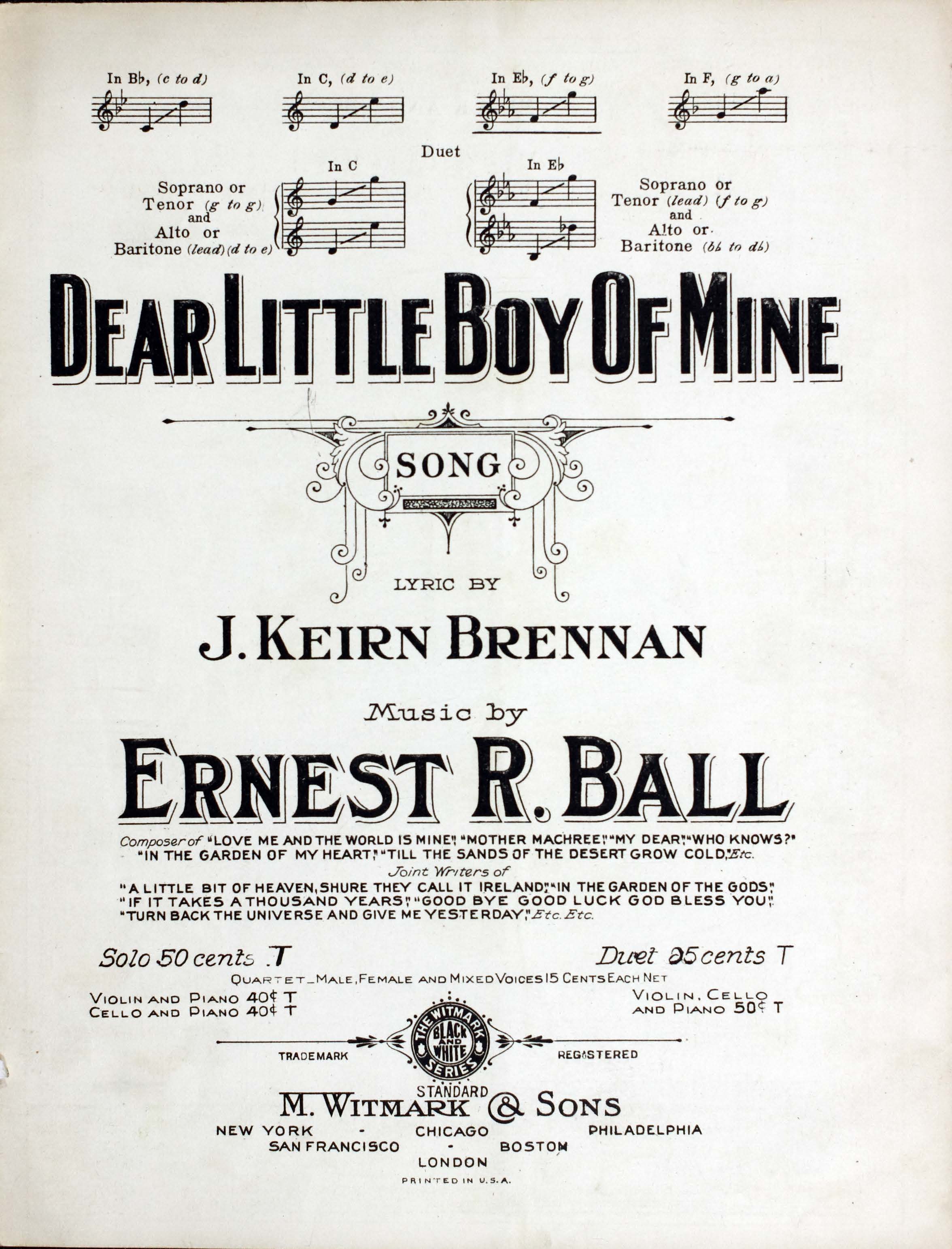 Ball, Ernest R., 1878-1927. 2000. “Dear Little Boy of Mine : Song Lyric by J. Keirn Brennan ; Music by Ernest R. Ball”. New York : M. Witmark & Sons, World War I Sheet Music, accessed February 11, 2026, https://digitalexhibits.library.wustl.edu/s/wwimusic/item/36941