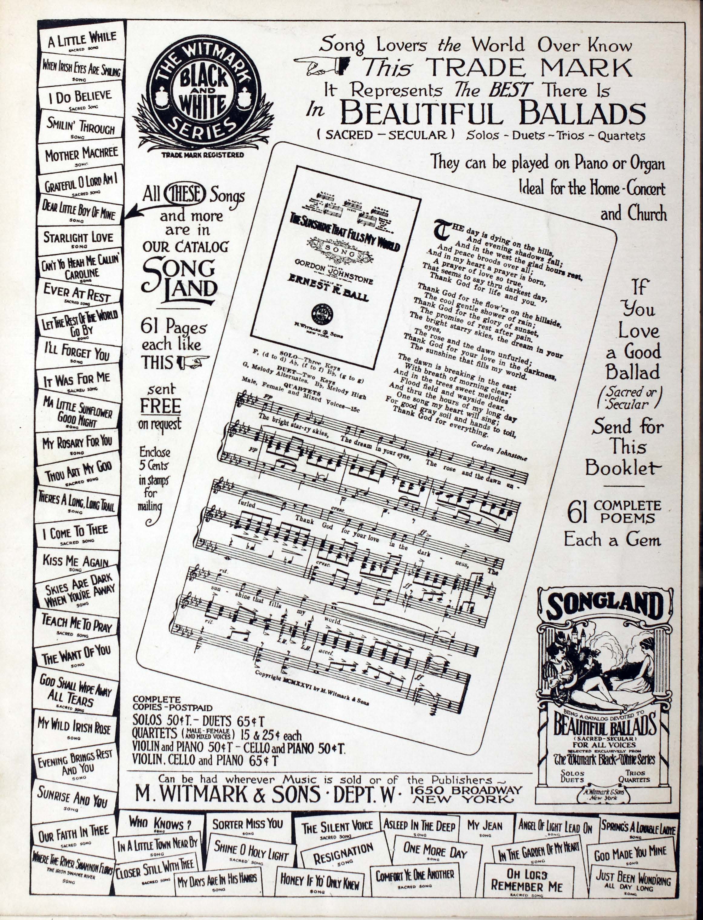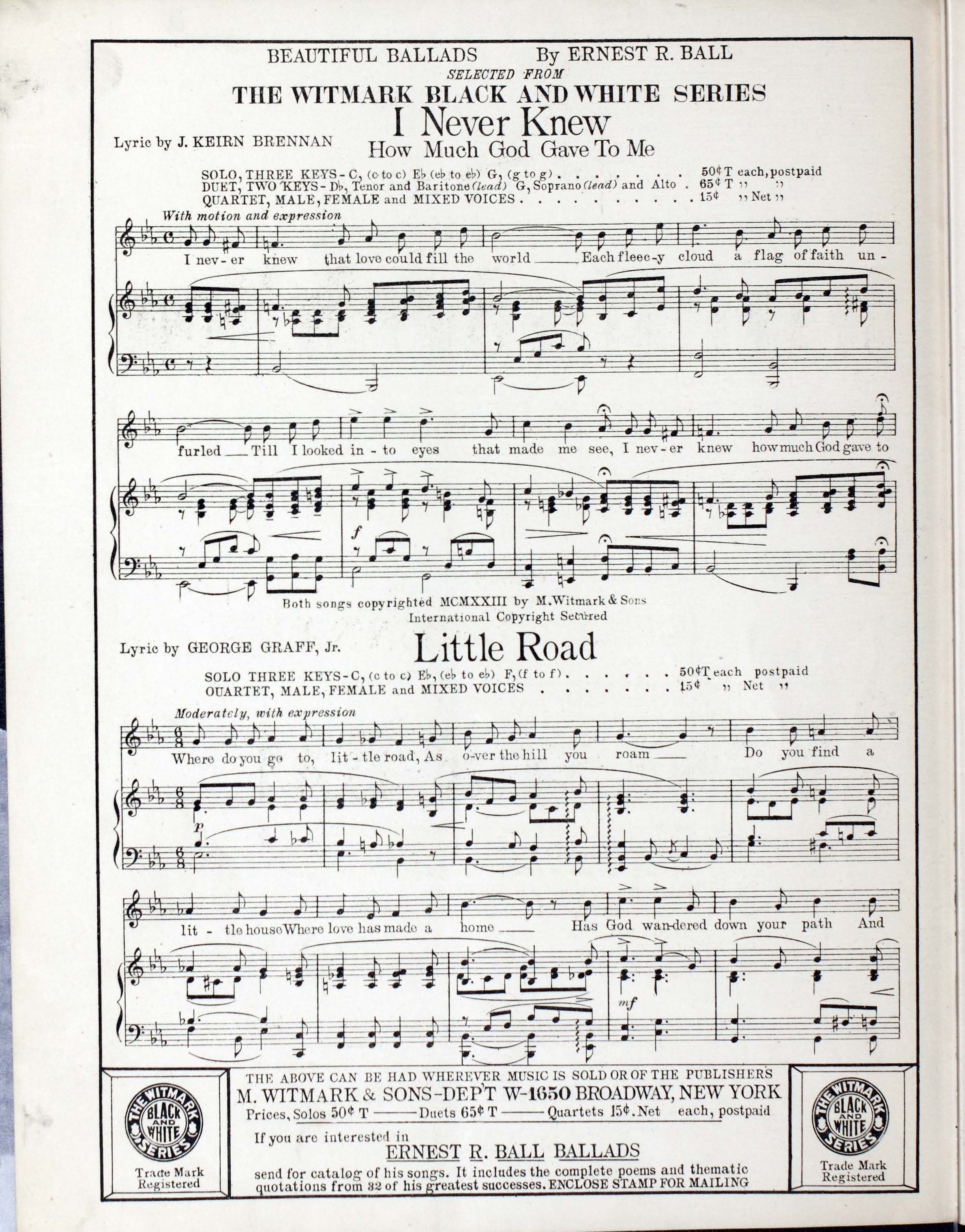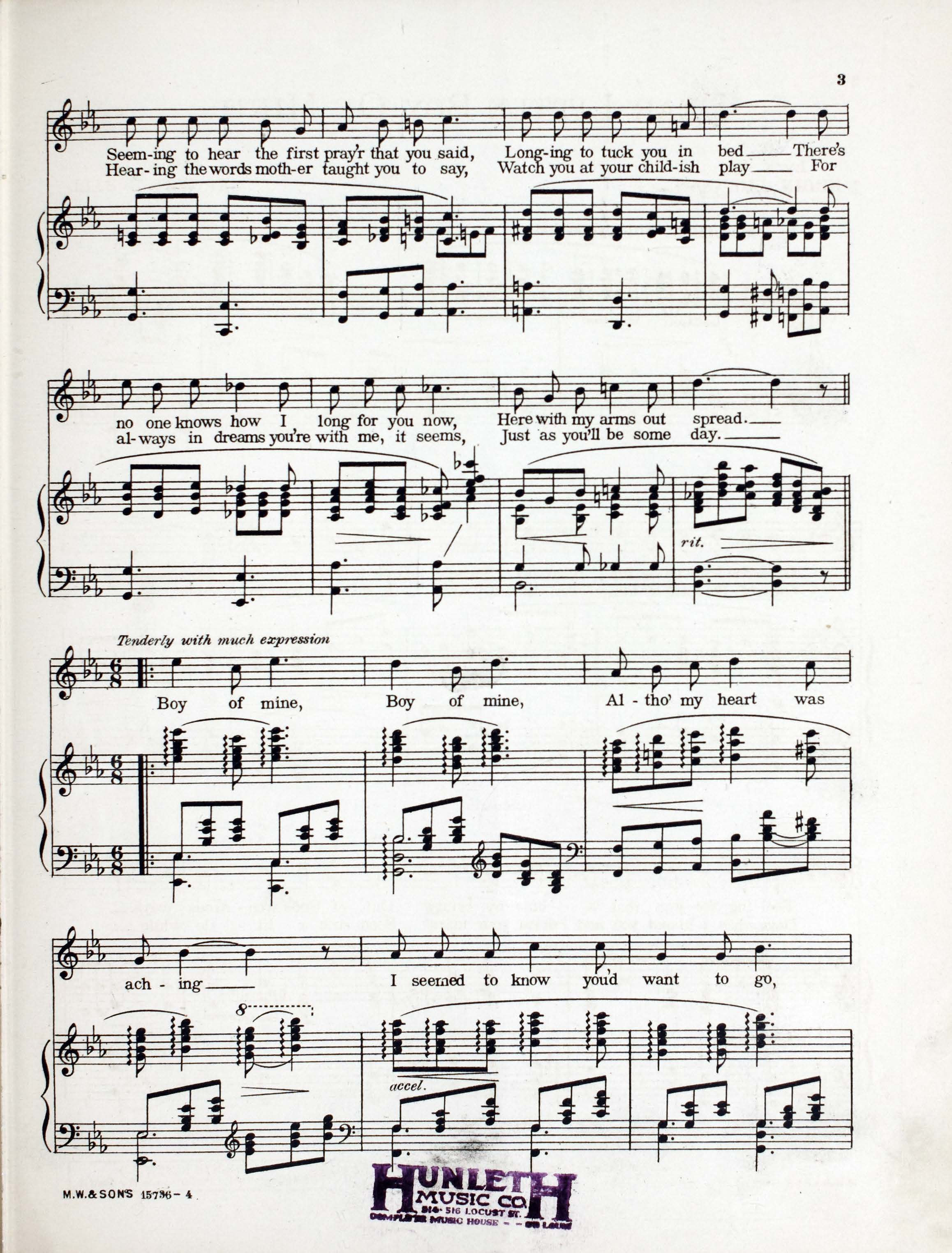 Ball, Ernest R., 1878-1927. 2000. “Dear Little Boy of Mine : Song Lyric by J. Keirn Brennan ; Music by Ernest R. Ball”. New York : M. Witmark & Sons, World War I Sheet Music, accessed February 11, 2026, https://digitalexhibits.library.wustl.edu/s/wwimusic/item/36941