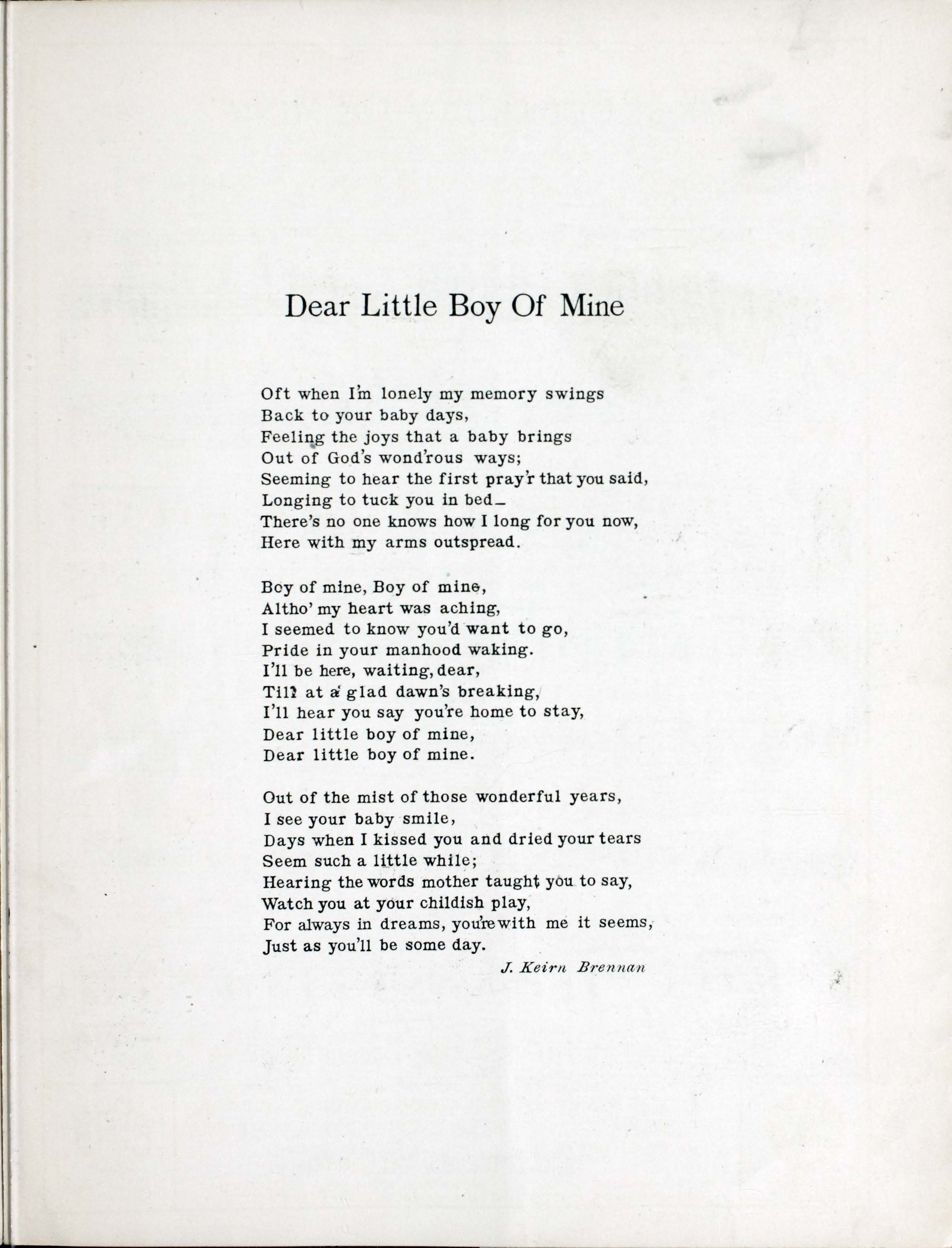 - Dear little boy of mine : song / lyric by J. Keirn Brennan ; music by Ernest R. Ball.