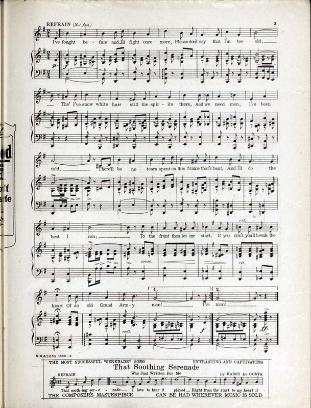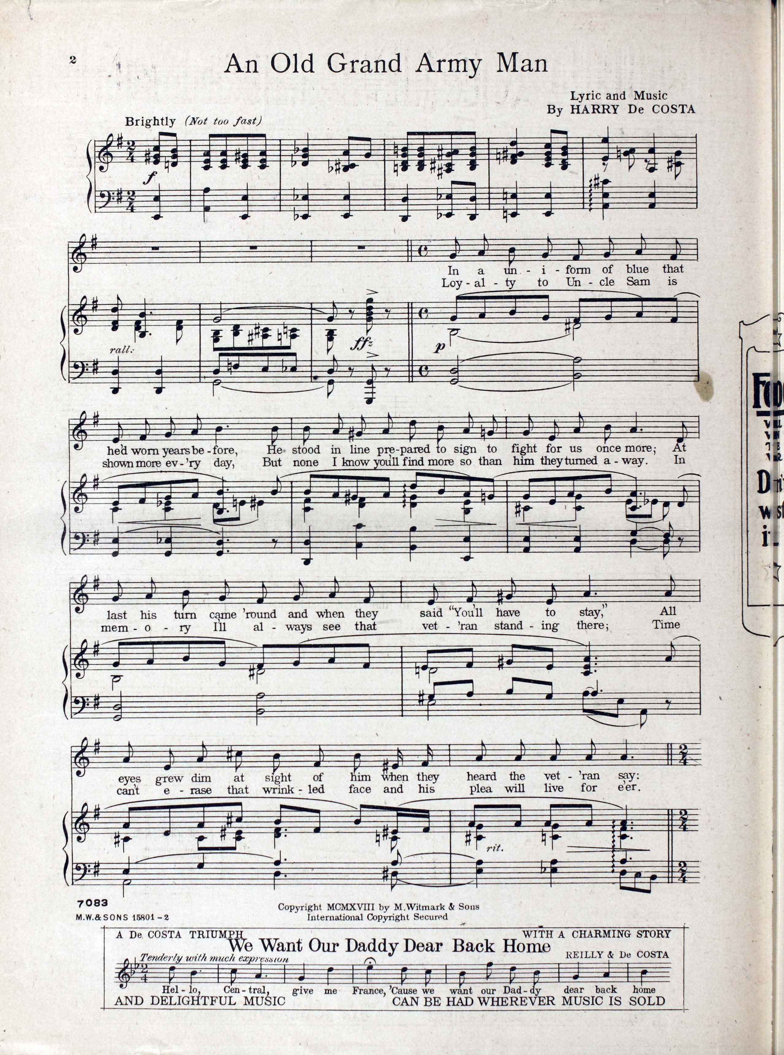 De Costa, Harry, 1885-1964. 2000. “An Old Grand Army Man : March Song Words and Music by Harry De Costa”. New York : M. Witmark and Sons, World War I Sheet Music, accessed February 11, 2026, https://digitalexhibits.library.wustl.edu/s/wwimusic/item/36945