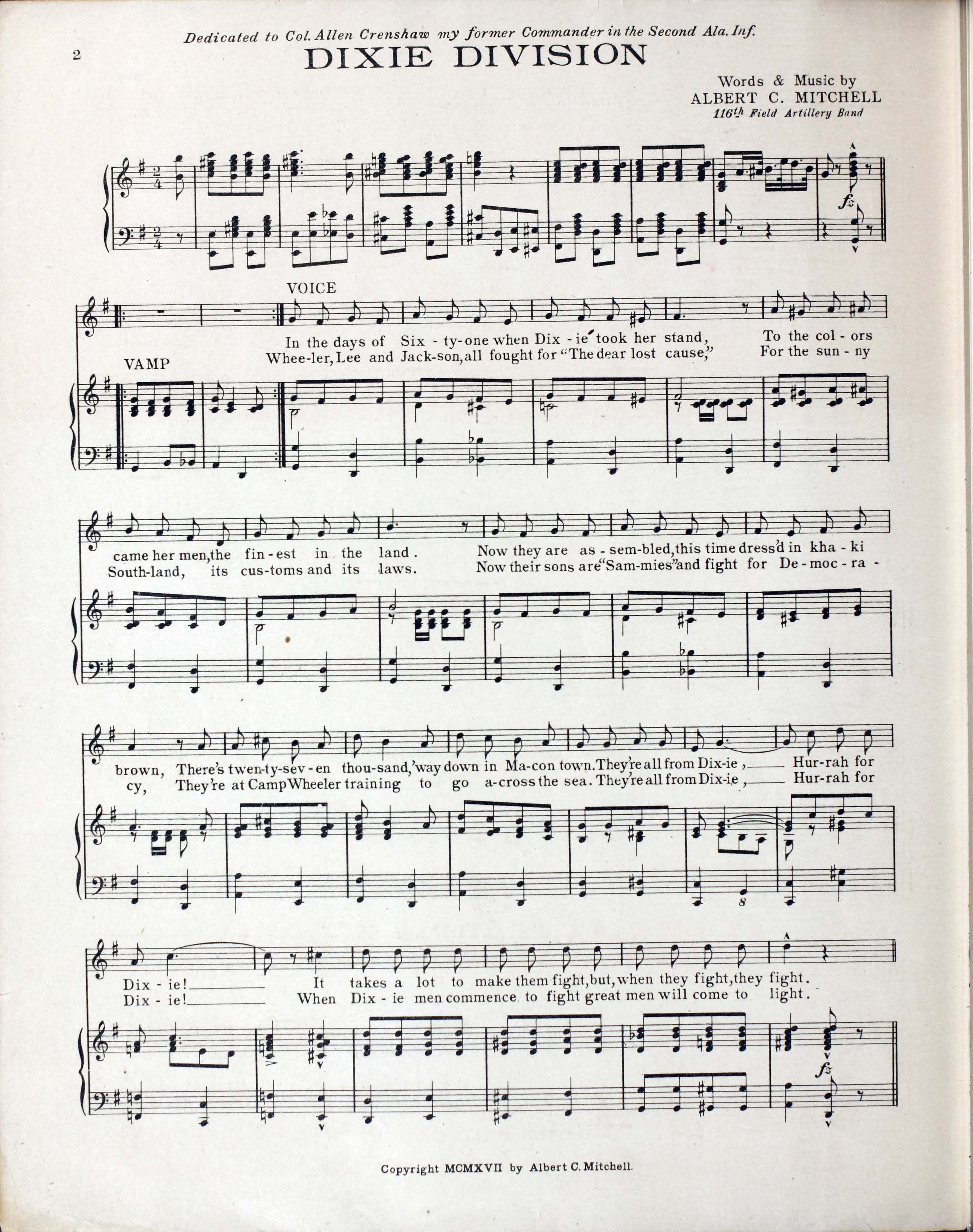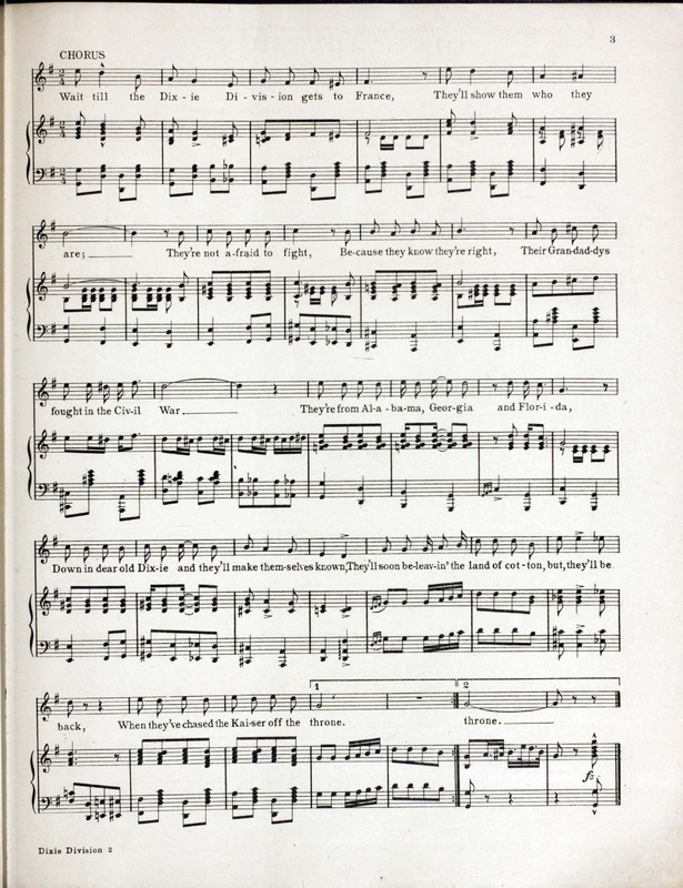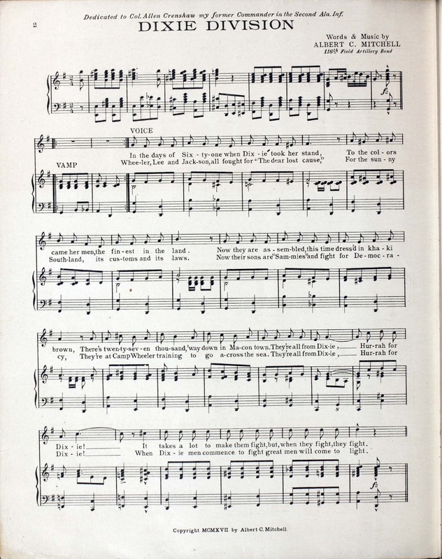 Mitchell, Albert C. (Albert Carlyle). n.d. “Dixie Division : Song Words and Music by Albert C. Mitchell, 116 Field Artillery Band (formerly 2nd Ala. Inf. Band)”. [S.l. : s.n.], World War I Sheet Music, accessed April 2, 2026, https://digitalexhibits.library.wustl.edu/s/wwimusic/item/36948