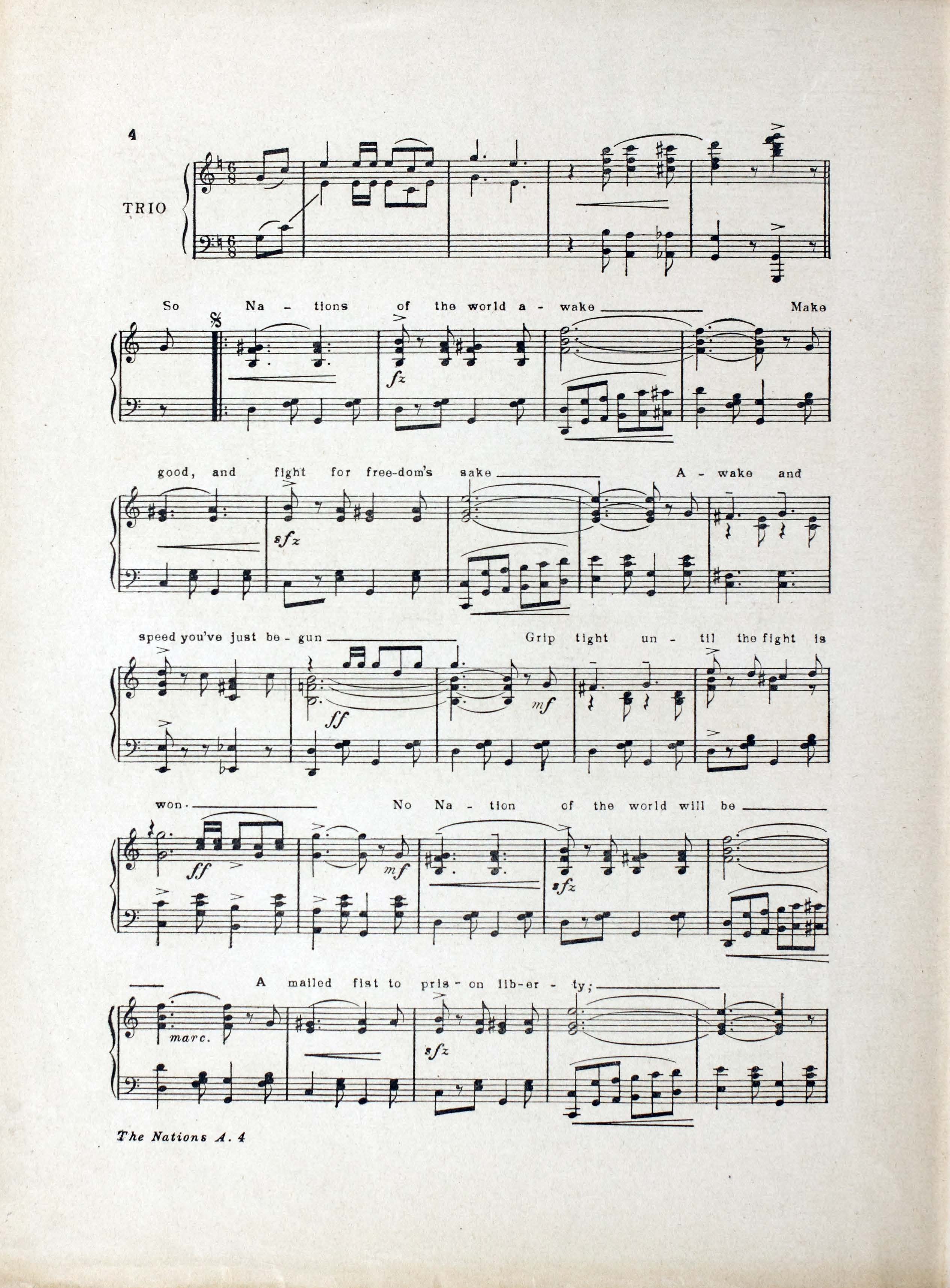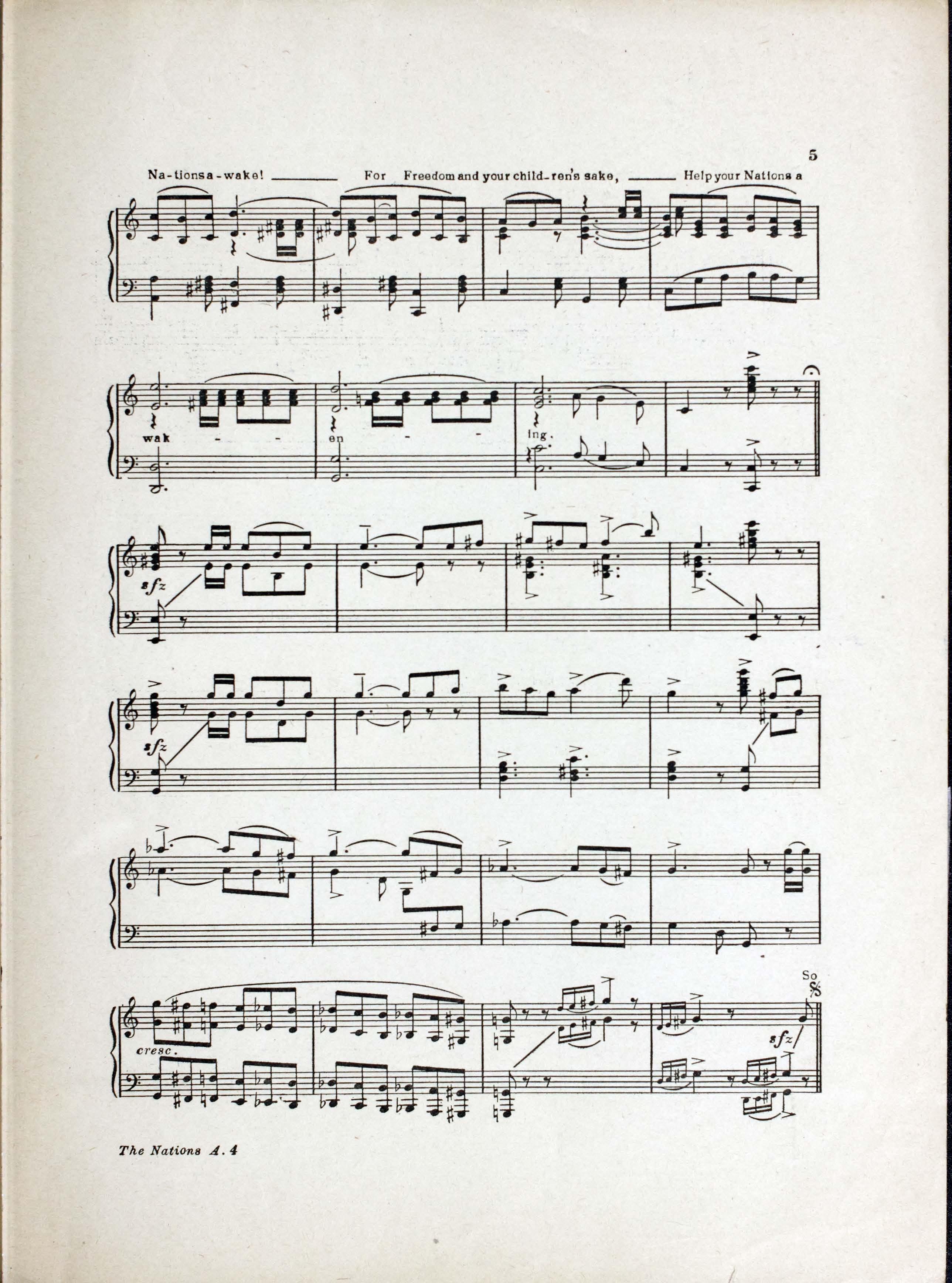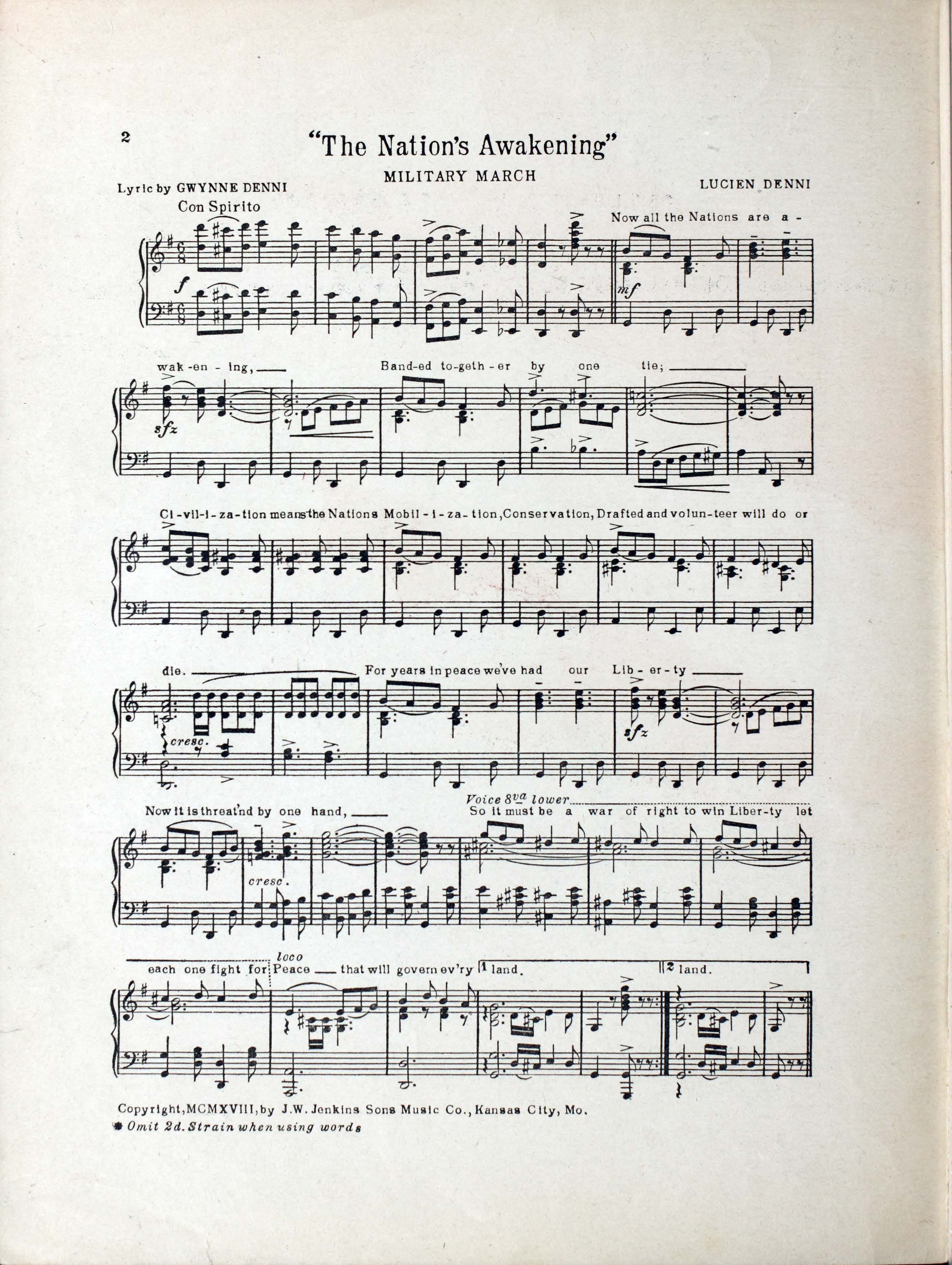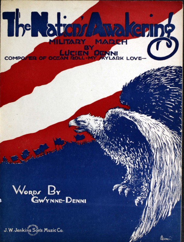 Denni, Lucien, 1886-1947. 2000. “The nation’s Awakening : Military March by Lucien Denni ; Words by Gwynne Denni”. Kansas City, Mo. : J.W. Jenkins Son’s Music Co., publishers, World War I Sheet Music, accessed February 11, 2026, https://digitalexhibits.library.wustl.edu/s/wwimusic/item/36953