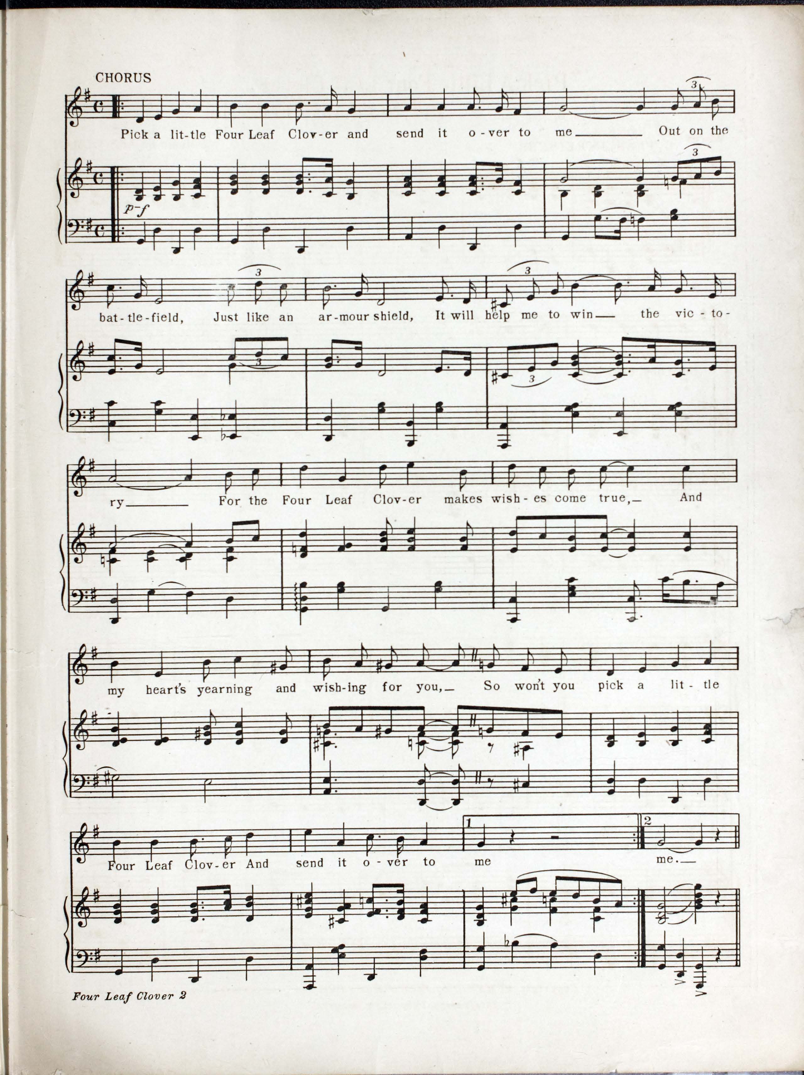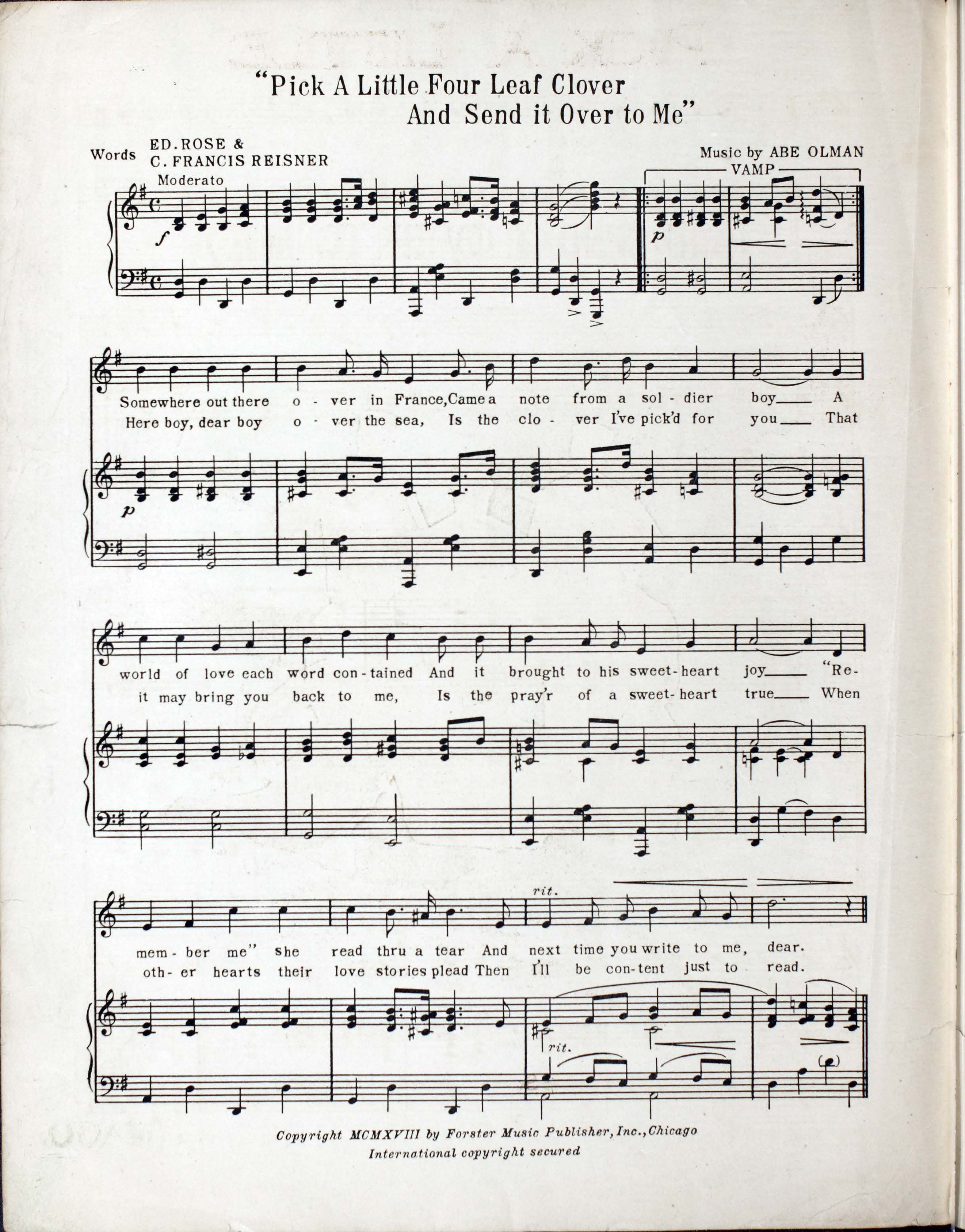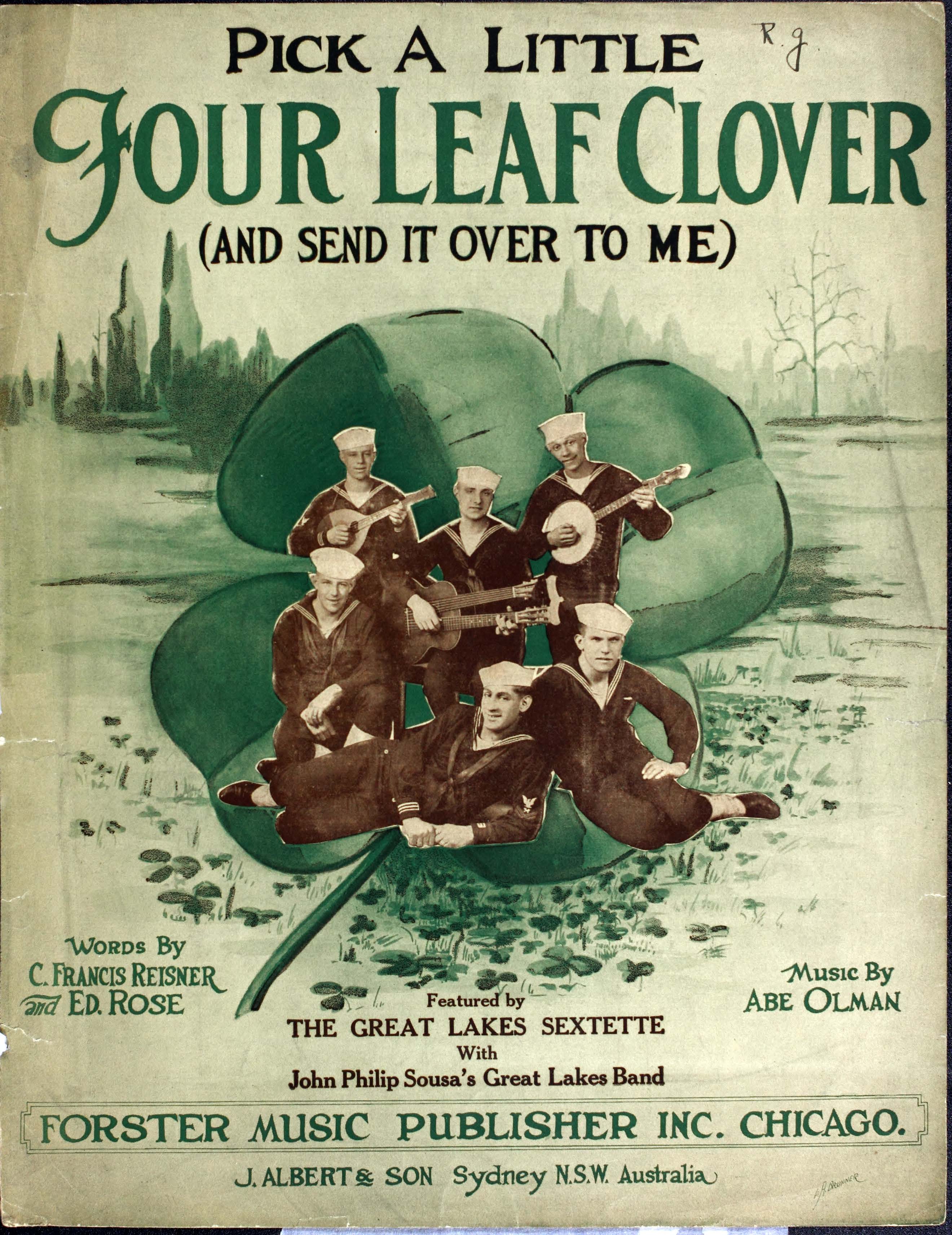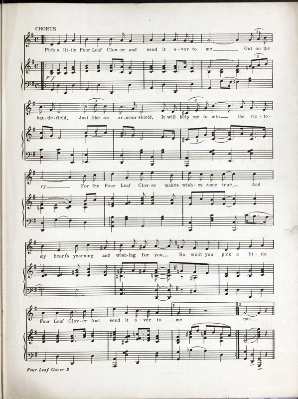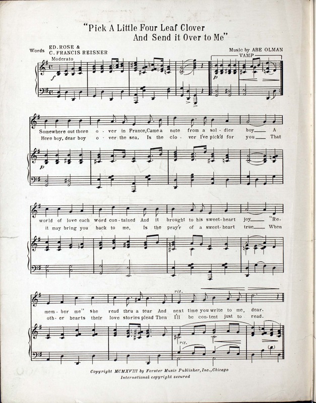 Olman, Abe. 2000. “Pick a Little Four Leaf Clover : (and Send It over to Me) Words by C. Francis Reisner and Ed. Rose ; Music by Abe Olman”. Chicago : Forster Music Publisher, Inc, World War I Sheet Music, accessed February 11, 2026, https://digitalexhibits.library.wustl.edu/s/wwimusic/item/36954