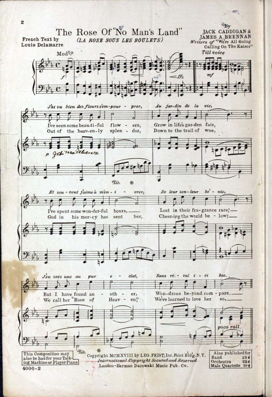 Brennan, James A. (James Alexander), 1885-1956. 2000. “The Rose of No man’s Land Words by Jack Caddigan ; Music by James A. Brennan”. New York : Leo Feist, Inc, World War I Sheet Music, accessed February 11, 2026, https://digitalexhibits.library.wustl.edu/s/wwimusic/item/36961