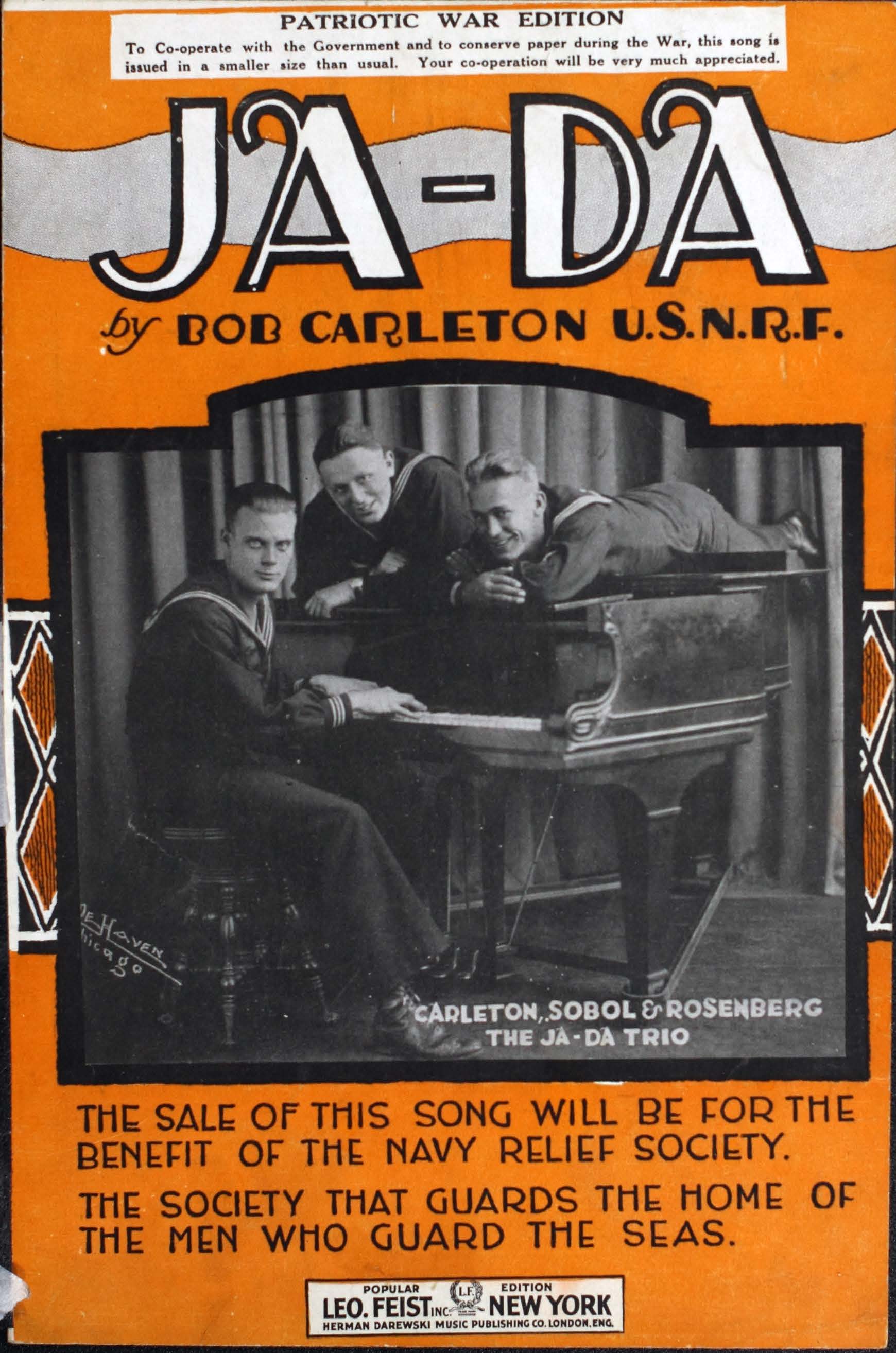 - T.p. ill. signed De Haven, Chicago: Photograph of Carleton, Sobol & Rosenberg, the Ja-Da Trio, in Navy uniforms and seated at or lying upon a baby grand piano.