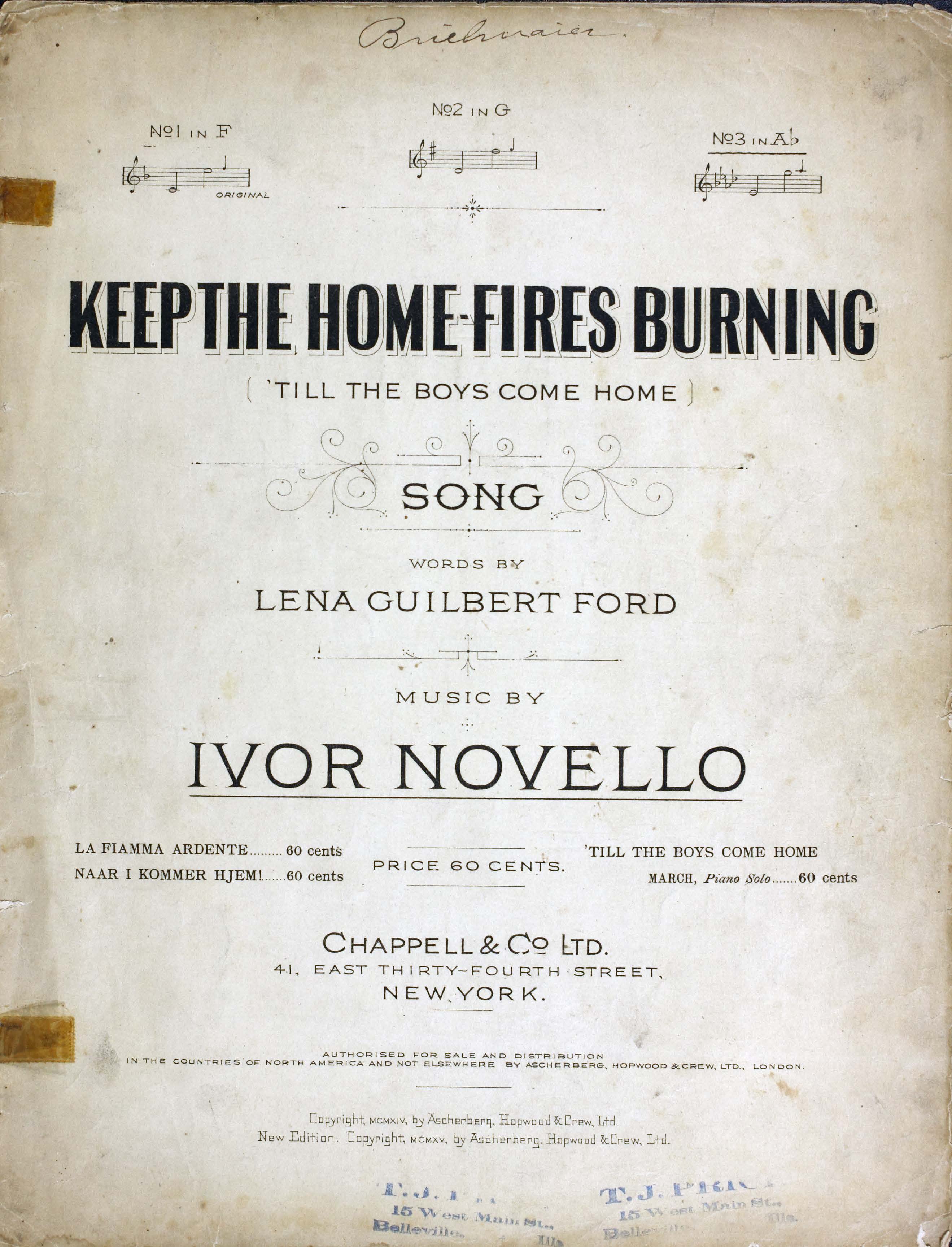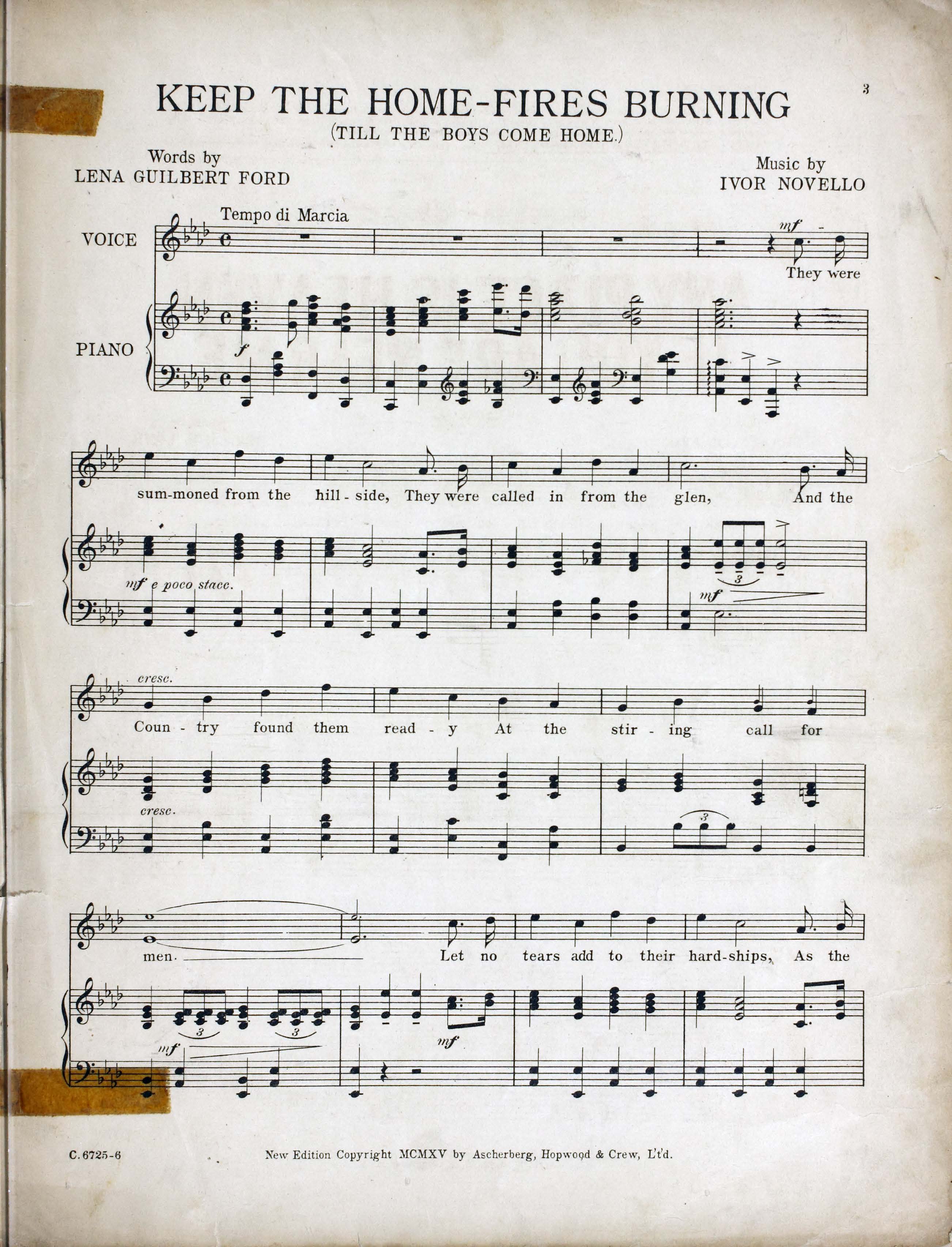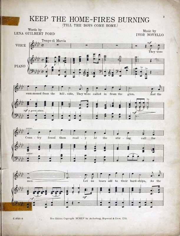 Novello, Ivor, 1893-1951. 2000. “Keep the Home-Fires Burning (’till the Boys Come Home) : Song Words by Lena Guilbert Ford ; Music by Ivor Novello”. New York (41 East Thirty-fourth Street, New York) : Chappell & Co. Ltd, World War I Sheet Music, accessed February 11, 2026, https://digitalexhibits.library.wustl.edu/s/wwimusic/item/36970