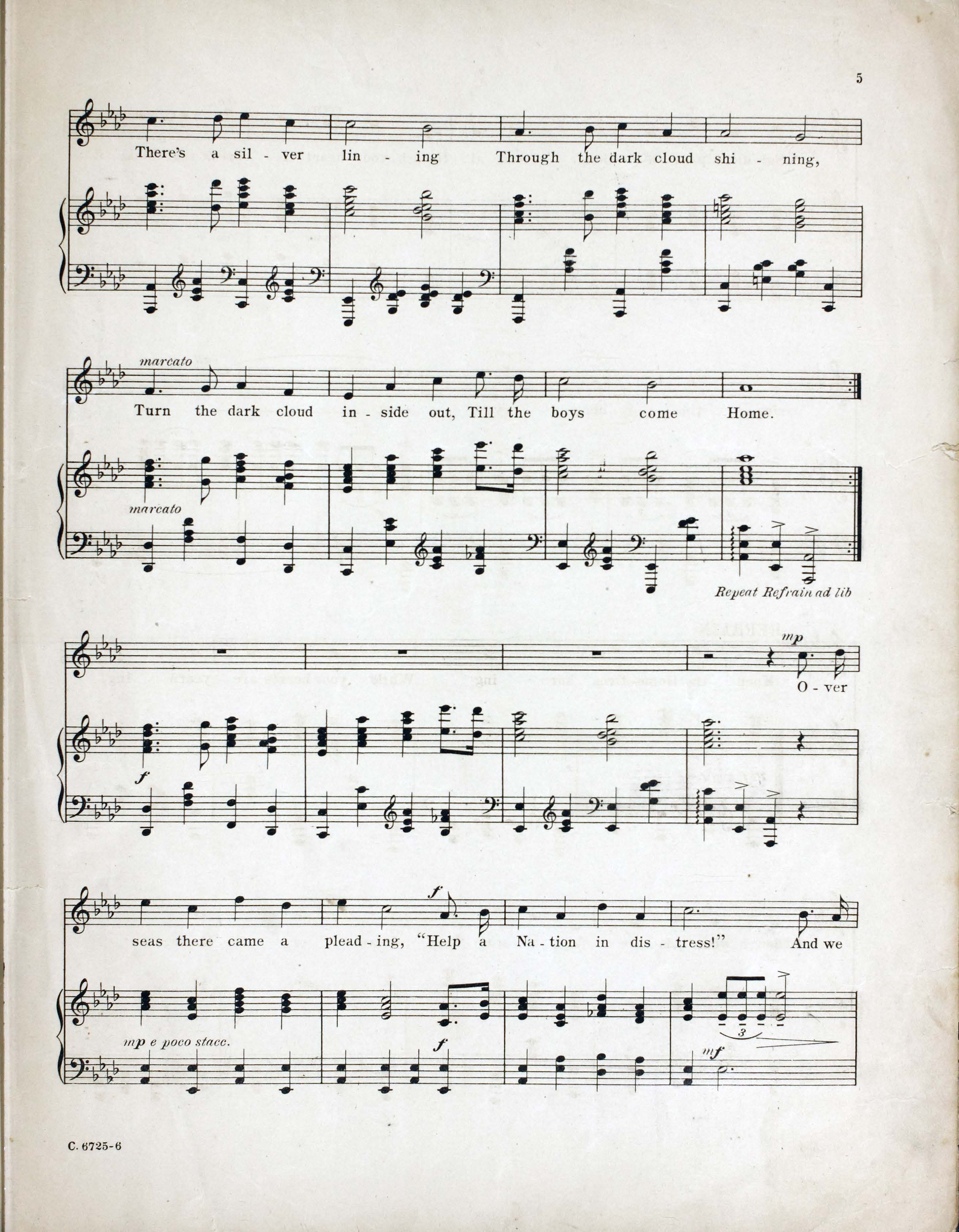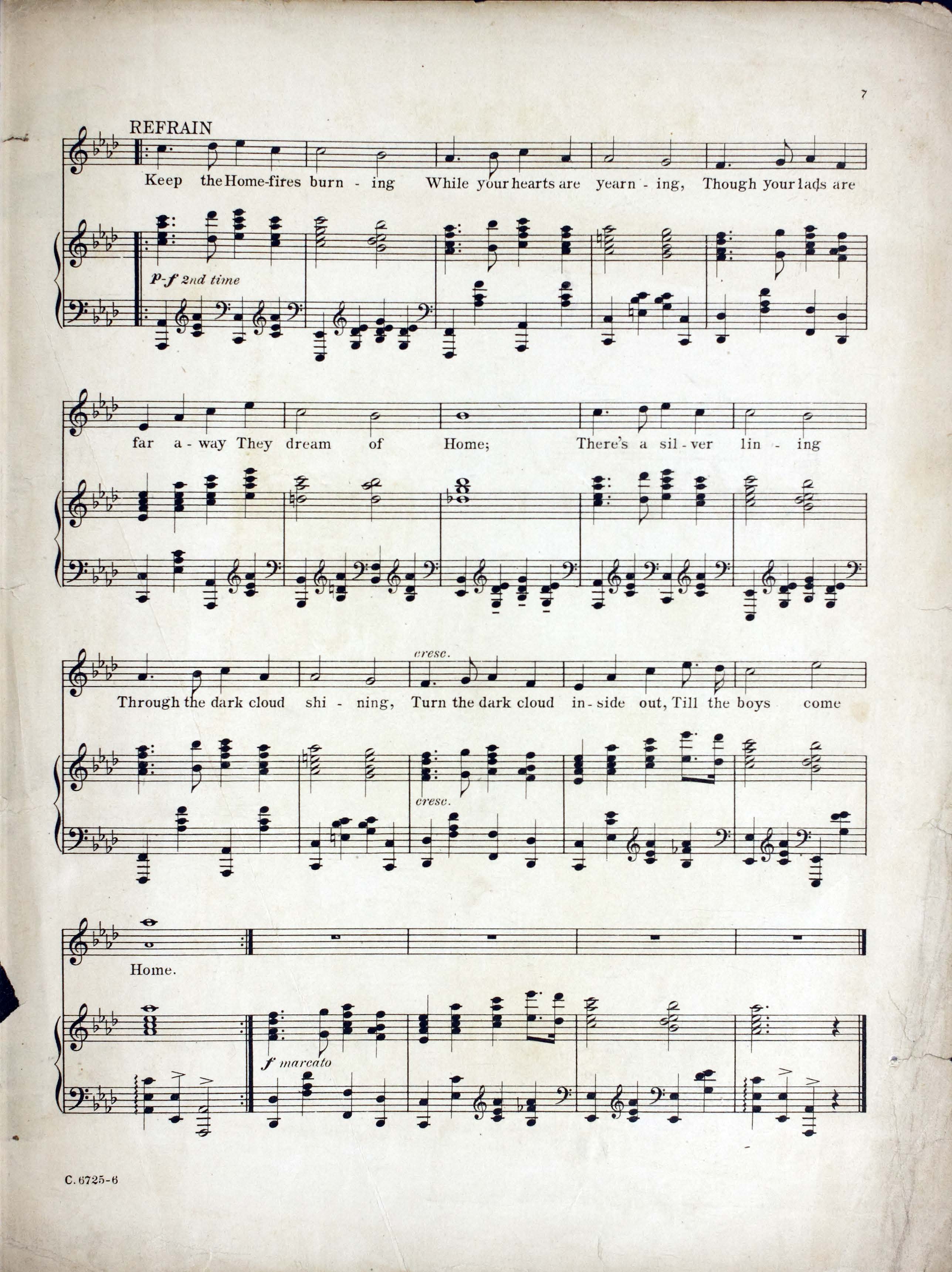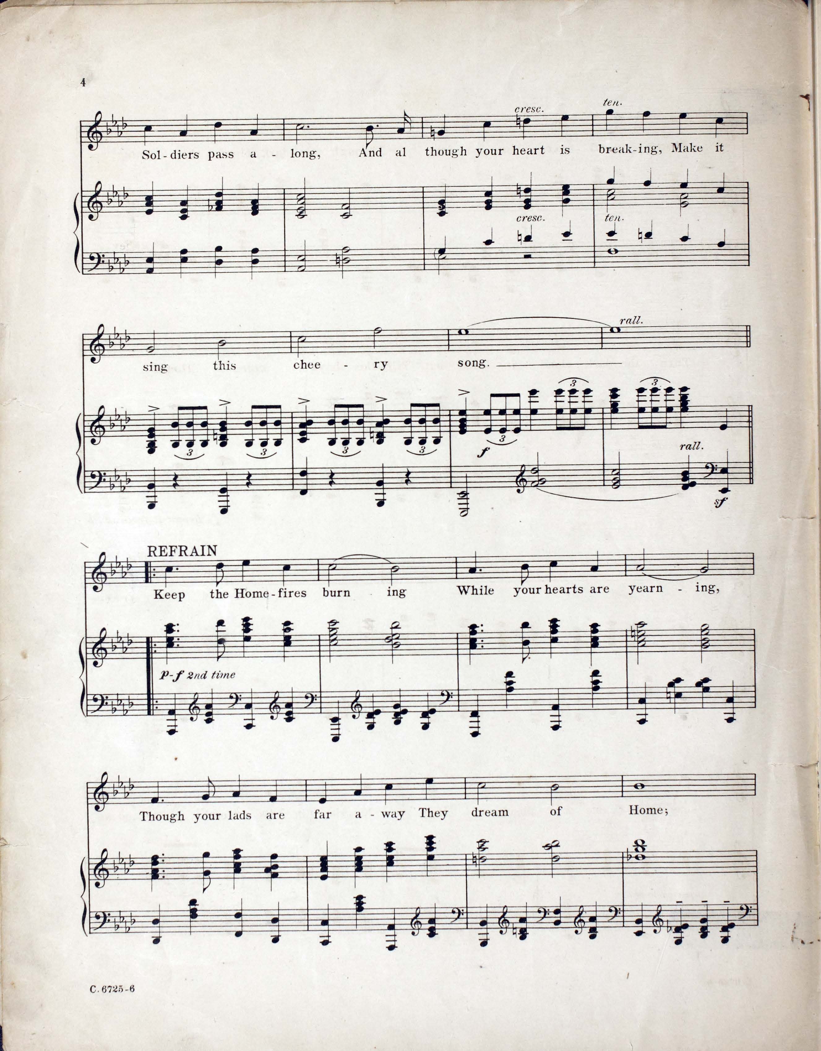 Novello, Ivor, 1893-1951. 2000. “Keep the Home-Fires Burning (’till the Boys Come Home) : Song Words by Lena Guilbert Ford ; Music by Ivor Novello”. New York (41 East Thirty-fourth Street, New York) : Chappell & Co. Ltd, World War I Sheet Music, accessed February 11, 2026, https://digitalexhibits.library.wustl.edu/s/wwimusic/item/36970