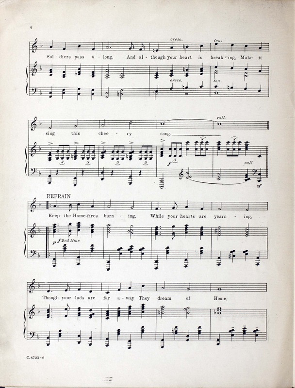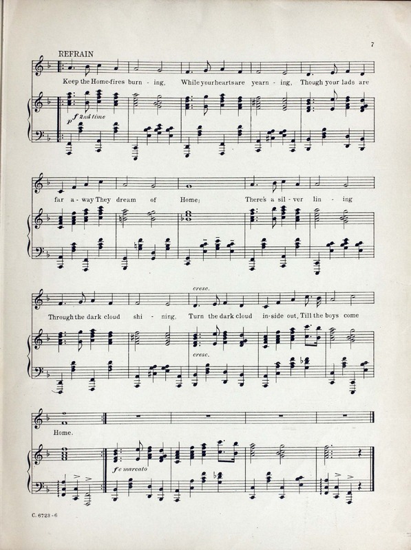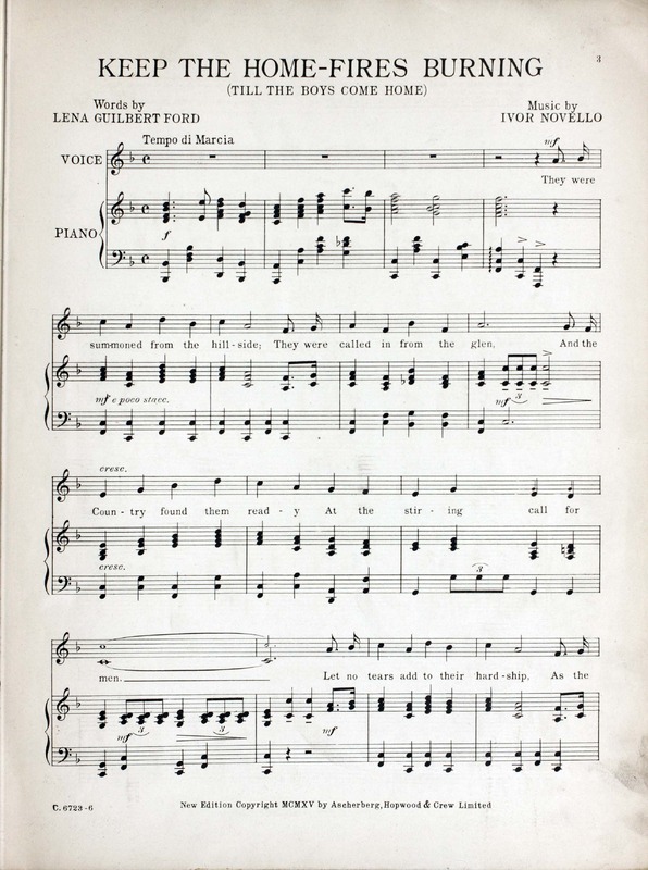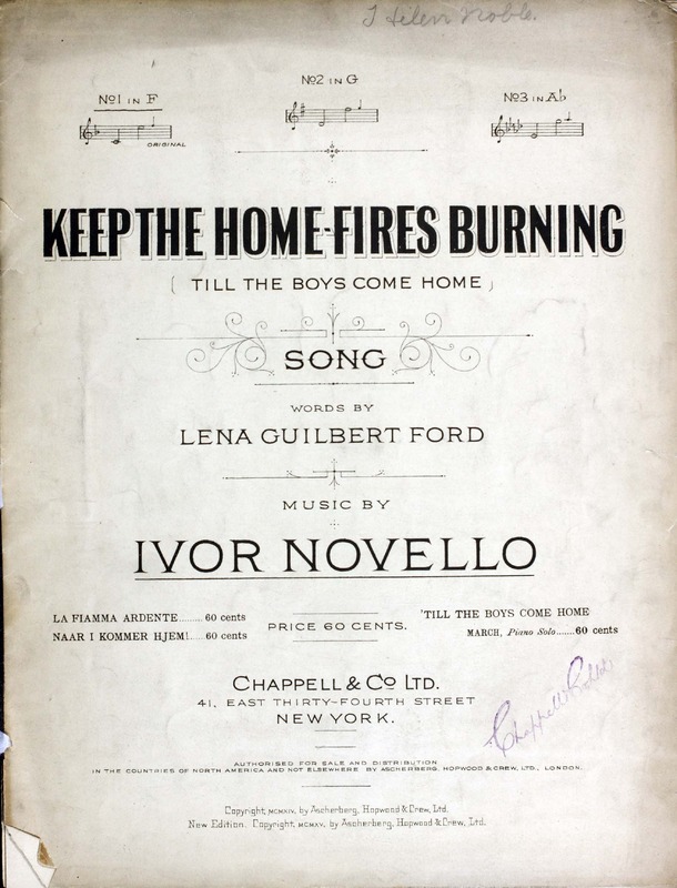 Novello, Ivor, 1893-1951. 2000. “Keep the Home-Fires Burning (’till the Boys Come Home) : Song Words by Lena Guilbert Ford ; Music by Ivor Novello”. New York (41 East Thirty-fourth Street, New York) : Chappell & Co. Ltd, World War I Sheet Music, accessed March 28, 2026, https://digitalexhibits.library.wustl.edu/s/wwimusic/item/36971