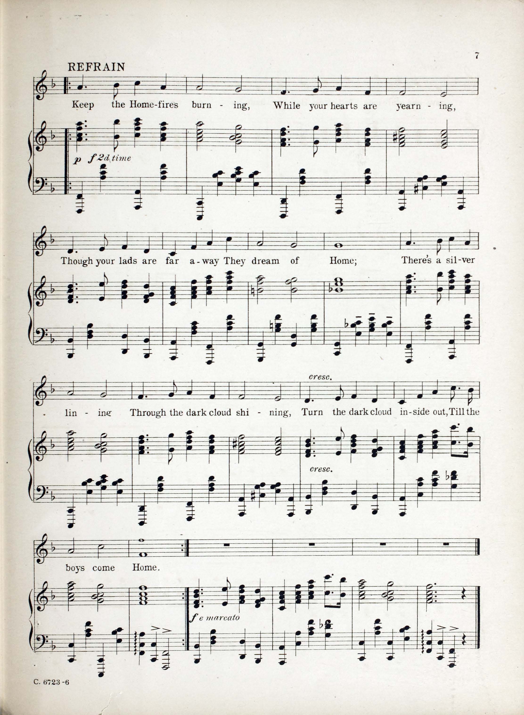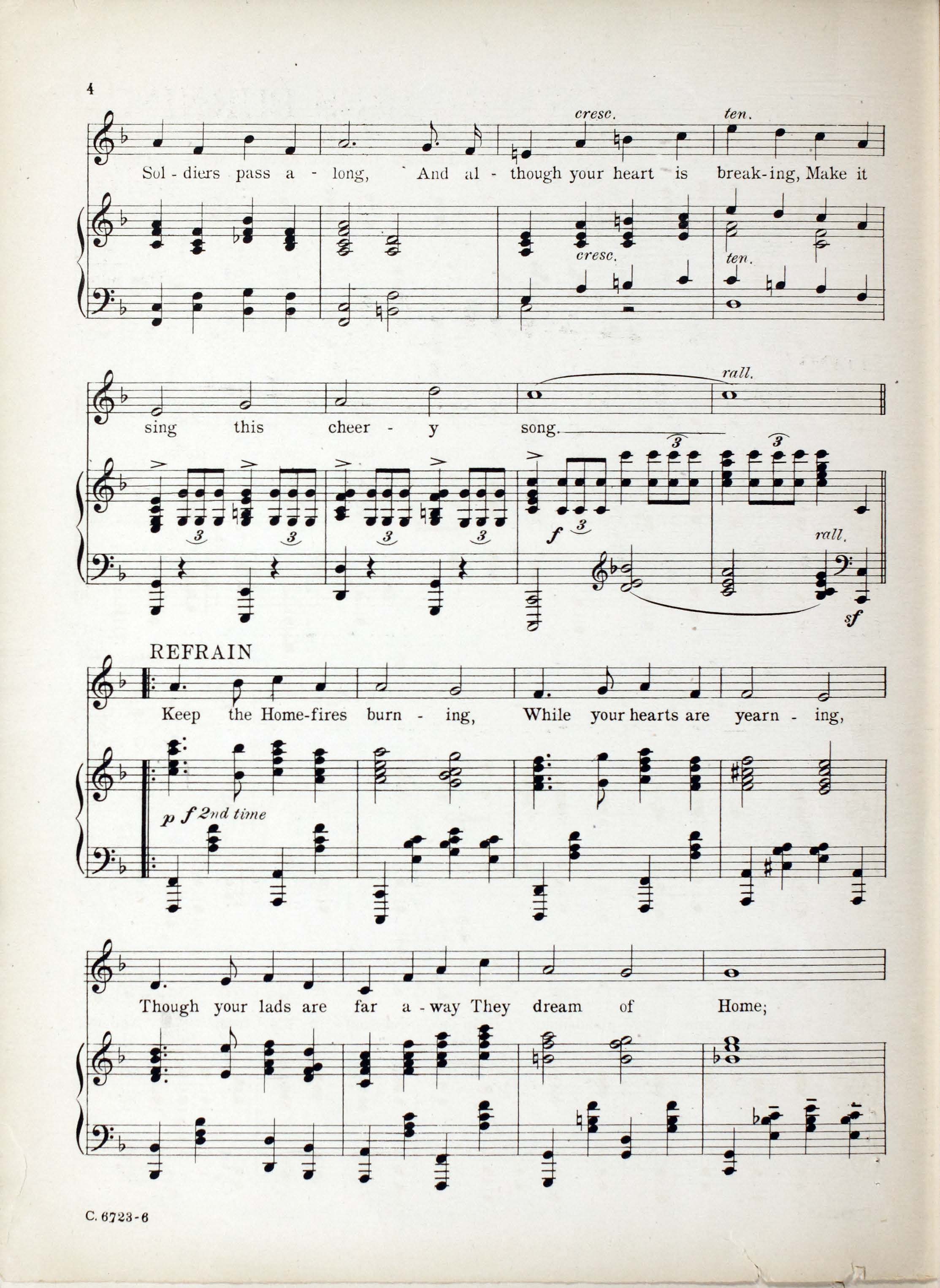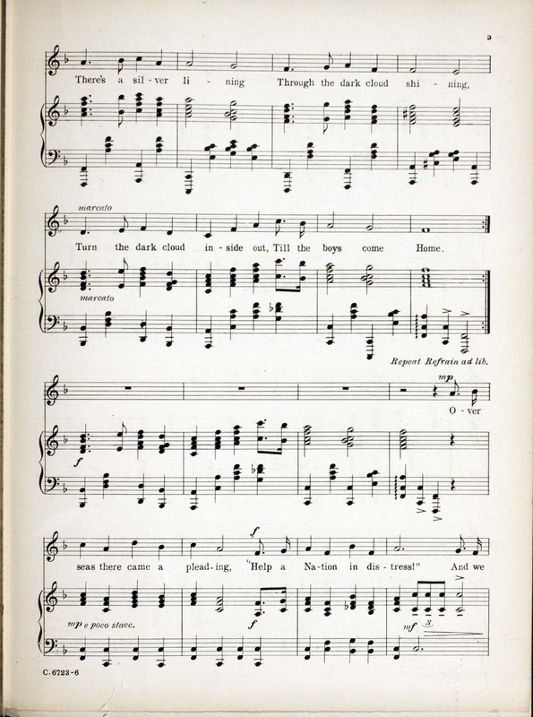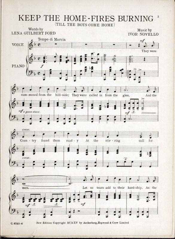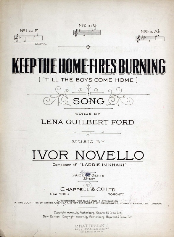 Novello, Ivor, 1893-1951. 2000. “Keep the Home-Fires Burning (’till the Boys Come Home) : Song Words by Lena Guilbert Ford ; Music by Ivor Novello”. New York (41 East Thirty-fourth Street, New York) : Chappell & Co. Ltd, World War I Sheet Music, accessed March 28, 2026, https://digitalexhibits.library.wustl.edu/s/wwimusic/item/36972