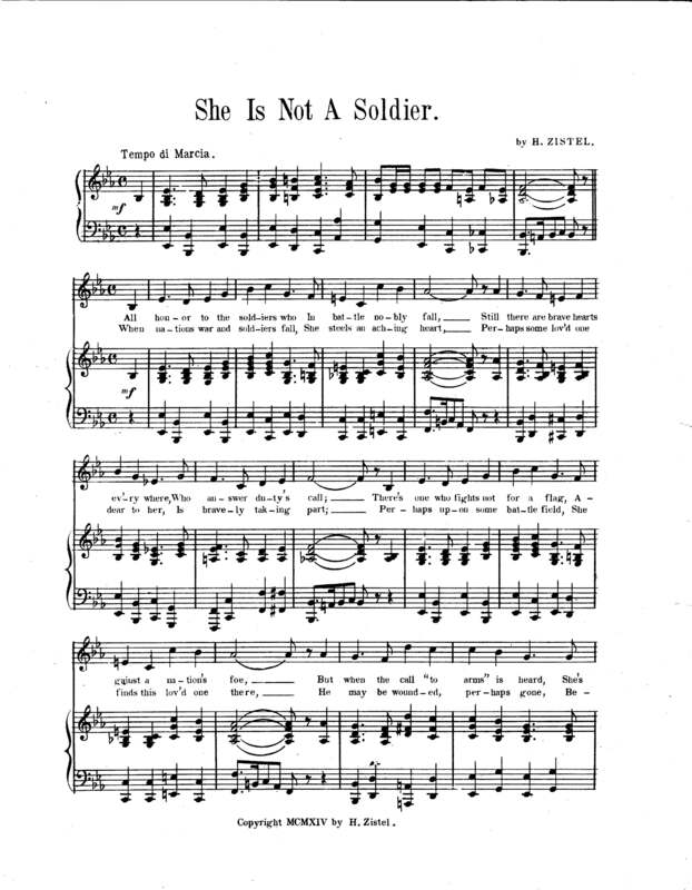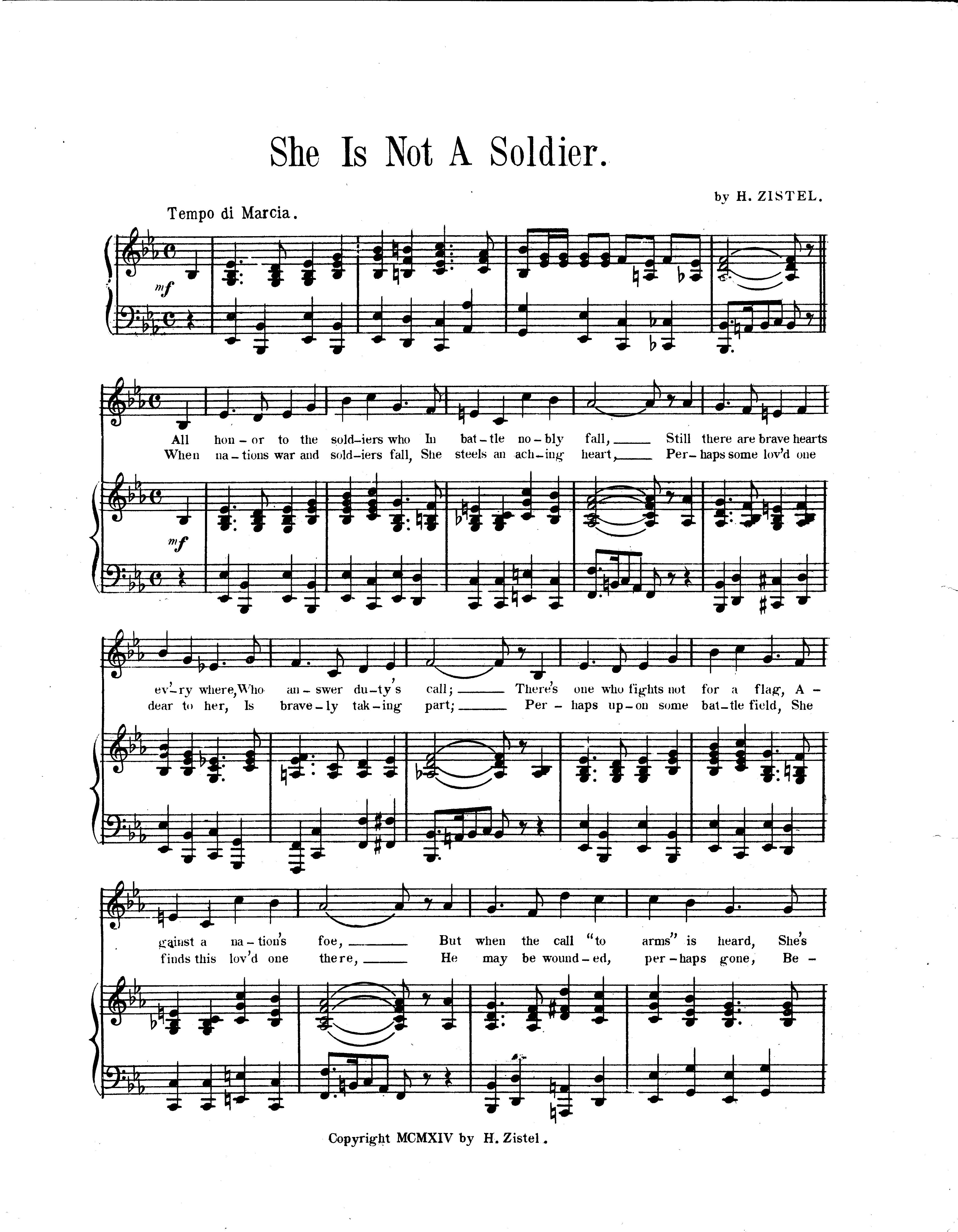 Zistel, H. 2000. “She Is Not a Soldier By H. Zistel”. St. Louis: published by Weile Publishing Company, World War I Sheet Music, accessed February 11, 2026, https://digitalexhibits.library.wustl.edu/s/wwimusic/item/37533