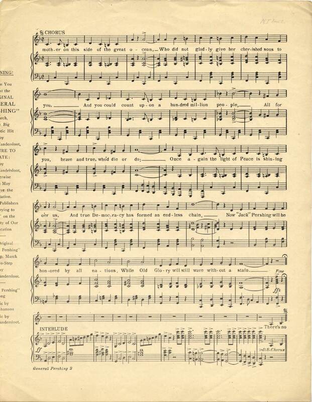 Lincoln, Harry J., 1878-1937. 2000. “General Pershing : Song Lyrics by J.R. Shannon and Ray Sherwood ; Music by Carl D. Vandersloot”. Williamsport, Penna. : Vandersloot Music Pub. Co, World War I Sheet Music, accessed February 11, 2026, https://digitalexhibits.library.wustl.edu/s/wwimusic/item/42943
