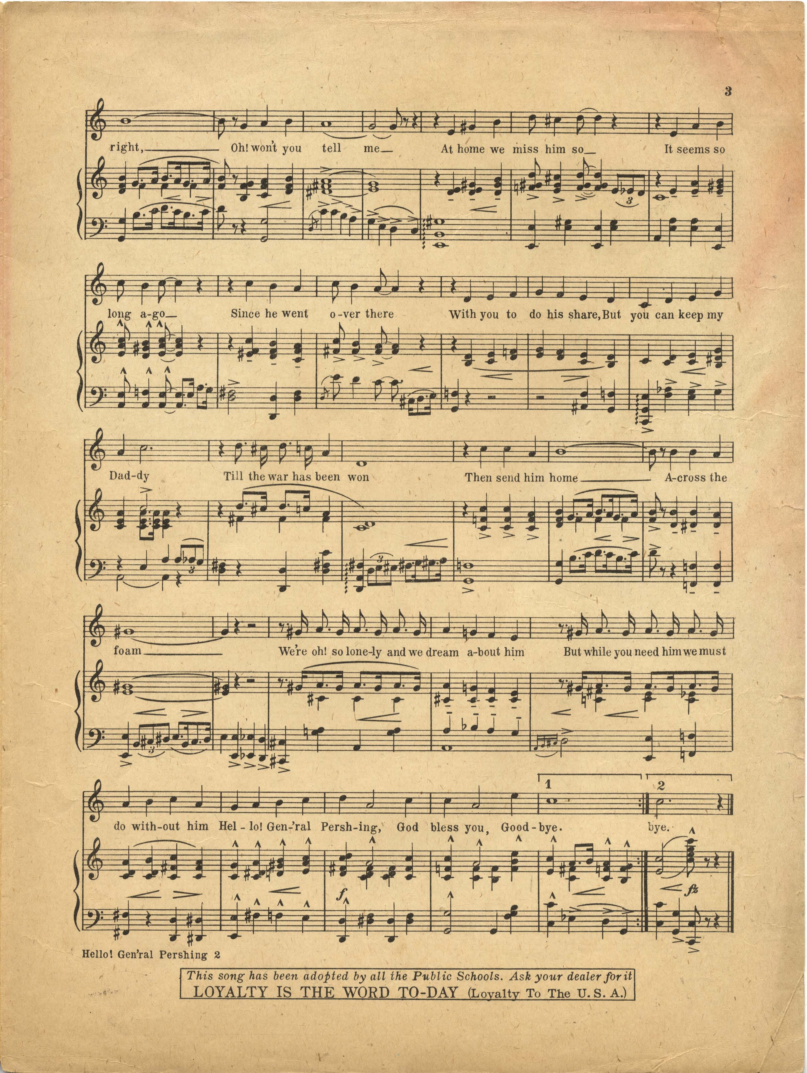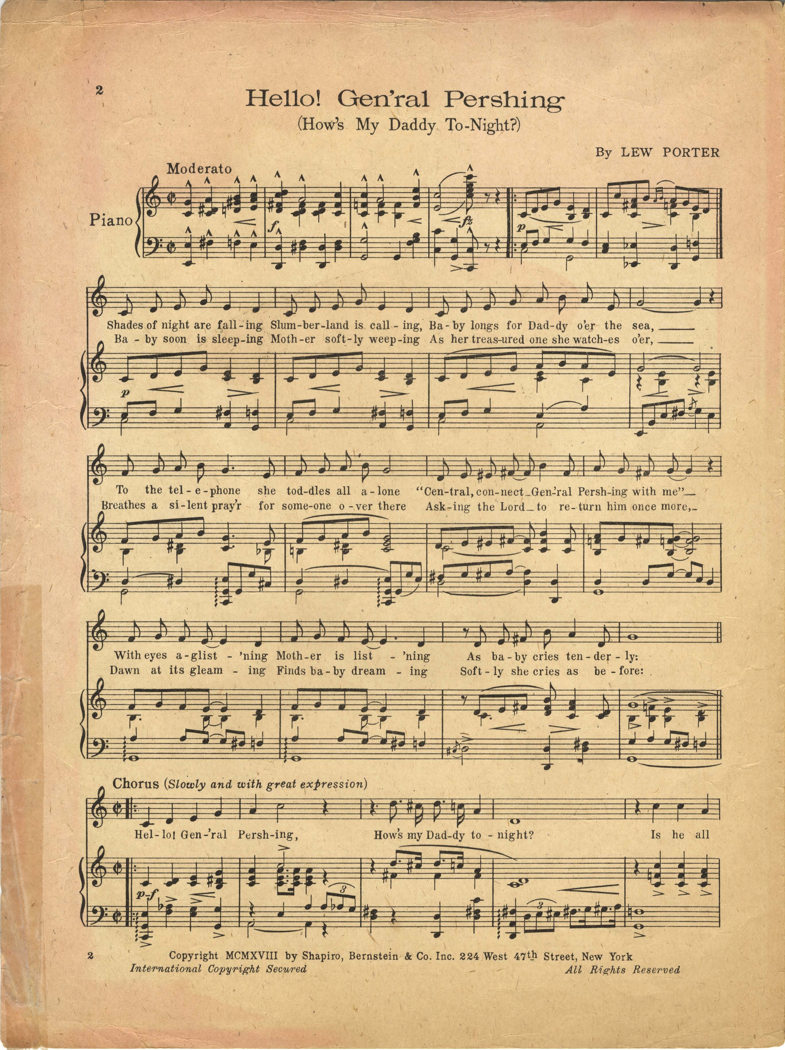 Porter, Lew. 2000. “Hello! Gen’ral Pershing : (how’s My Daddy to-night?) By Lew Porter”. New York (224 West 47th Street) : Shapiro, Bernstein & Co, World War I Sheet Music, accessed February 11, 2026, https://digitalexhibits.library.wustl.edu/s/wwimusic/item/42945