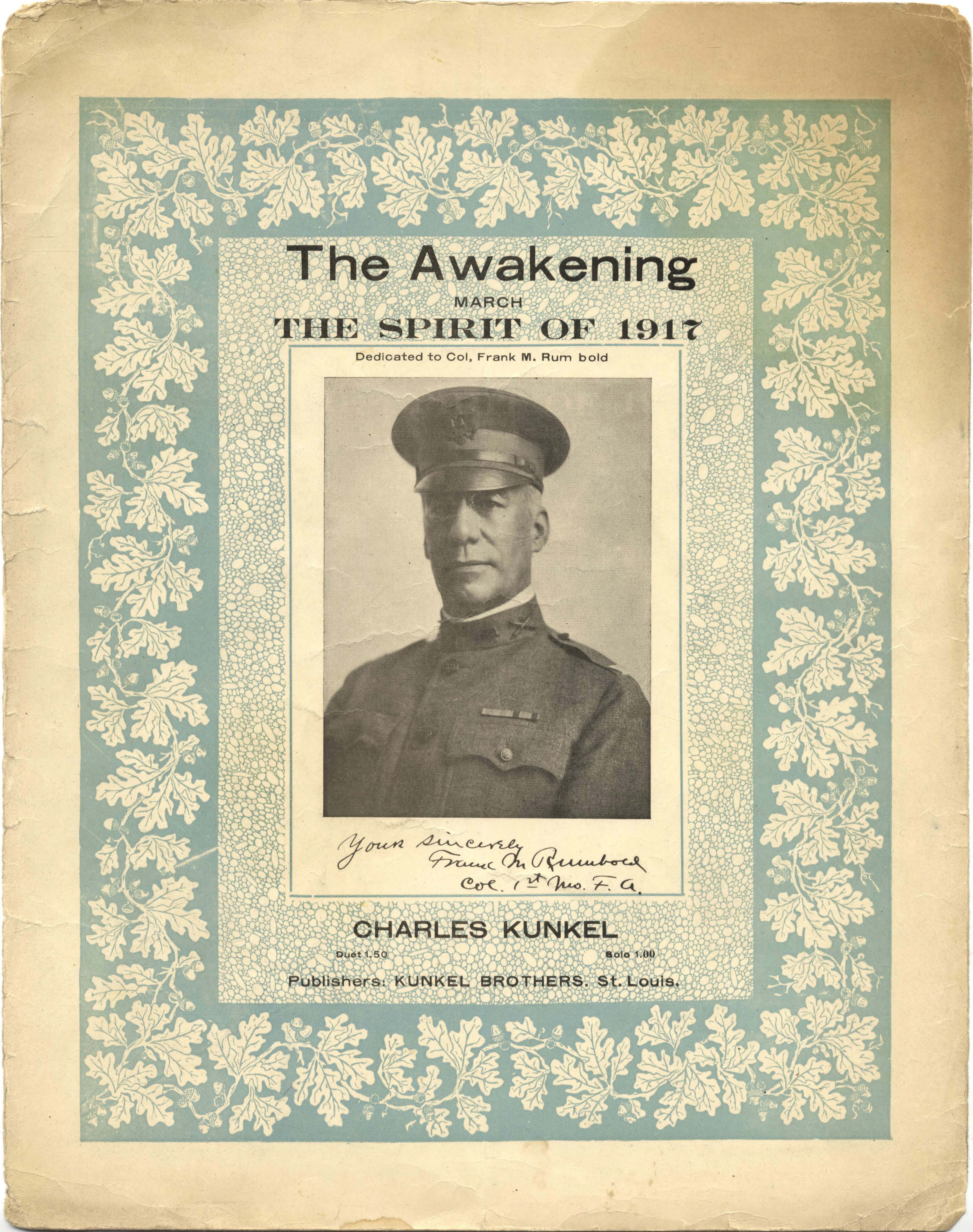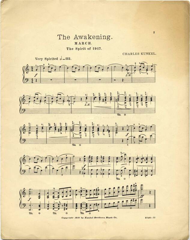 Kunkel, Charles, 1840-1923. 2000. “The Awakening : March : The Spirit of 1917 Charles Kunkel”. St. Louis : publishers, Kunkel Brothers, World War I Sheet Music, accessed February 11, 2026, https://digitalexhibits.library.wustl.edu/s/wwimusic/item/43141