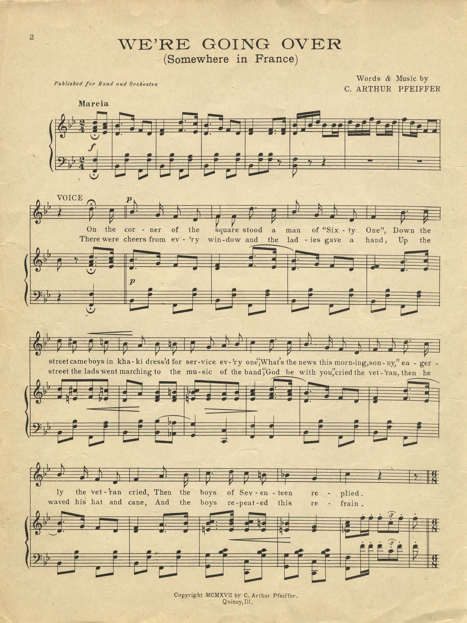 Pfeiffer, C. Arthur, active 1918. 2000. “We’re Going over : Somewhere in France”. Quincy, Ill., U.S.A. : published by C. Arthur Pfeiffer, World War I Sheet Music, accessed February 10, 2026, https://digitalexhibits.library.wustl.edu/s/wwimusic/item/44904